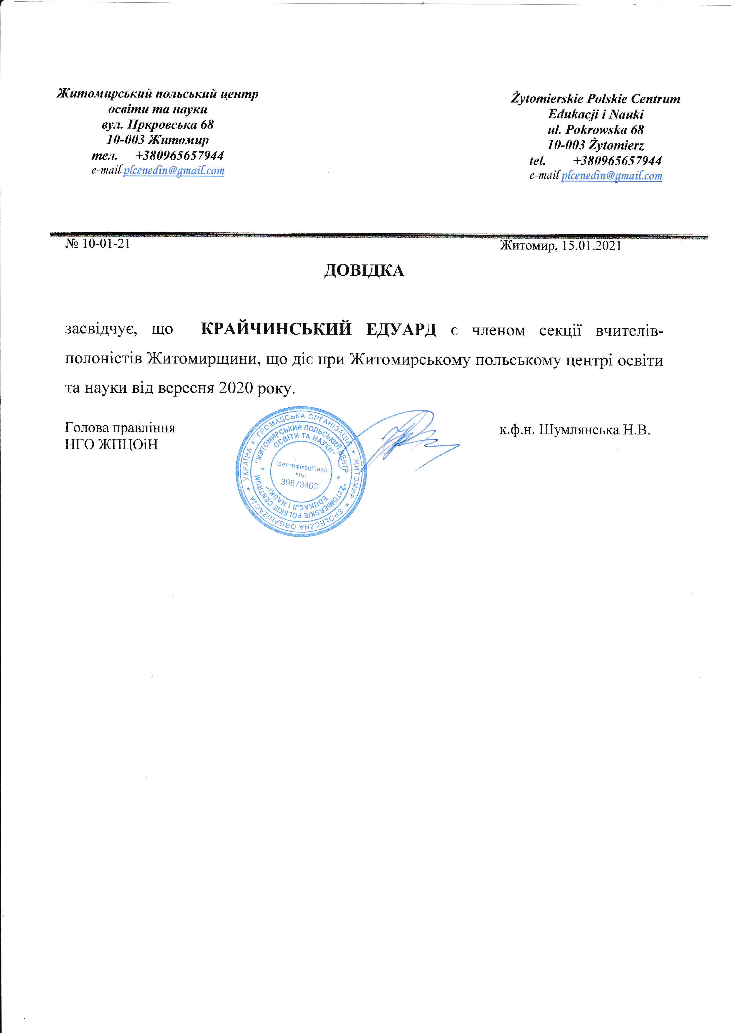 Член секції вчителів полоністів Житомирщини при Житомирському центрі освіти і науки