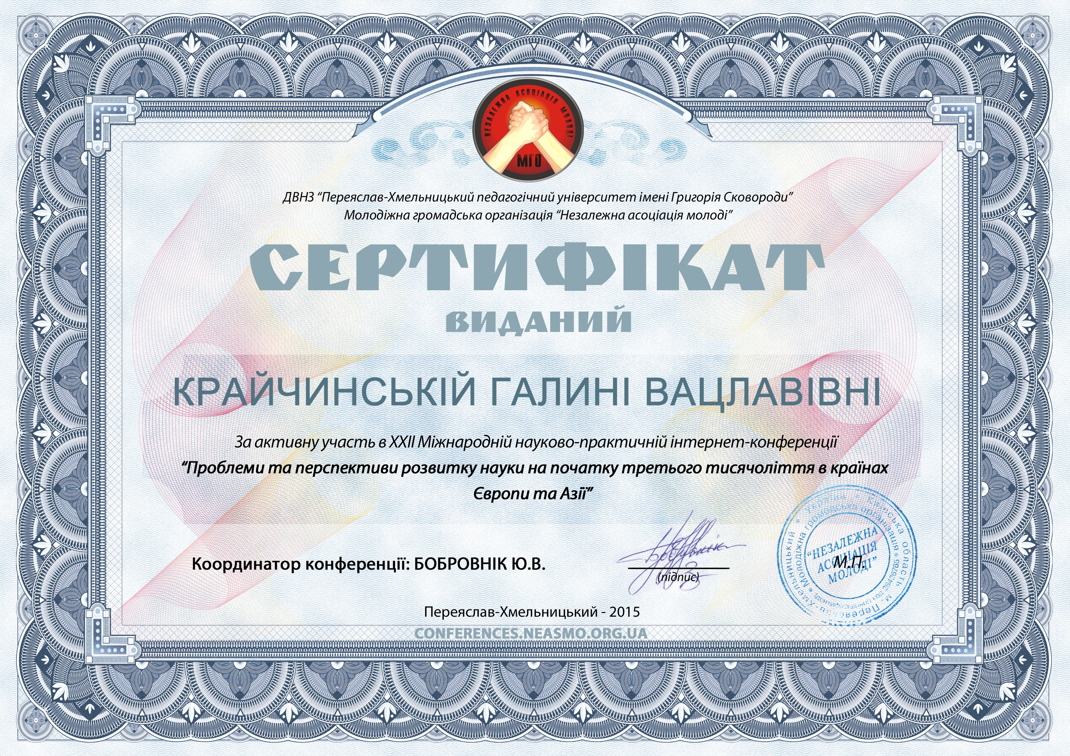 Виступ з доповіддю на тему "Гра слів як стилістичний прийом увиразнення висловлювання (на матеріалі американського анімаційного телевізійного серіалу «Таємниці Гравіті Фолс») (Puns as a stylistic tool for accentuation of speech (based on the material of the American TV series Secrets of Gravity Falls)" на міжнародній інтернет-конференції English for Specific Purposes.