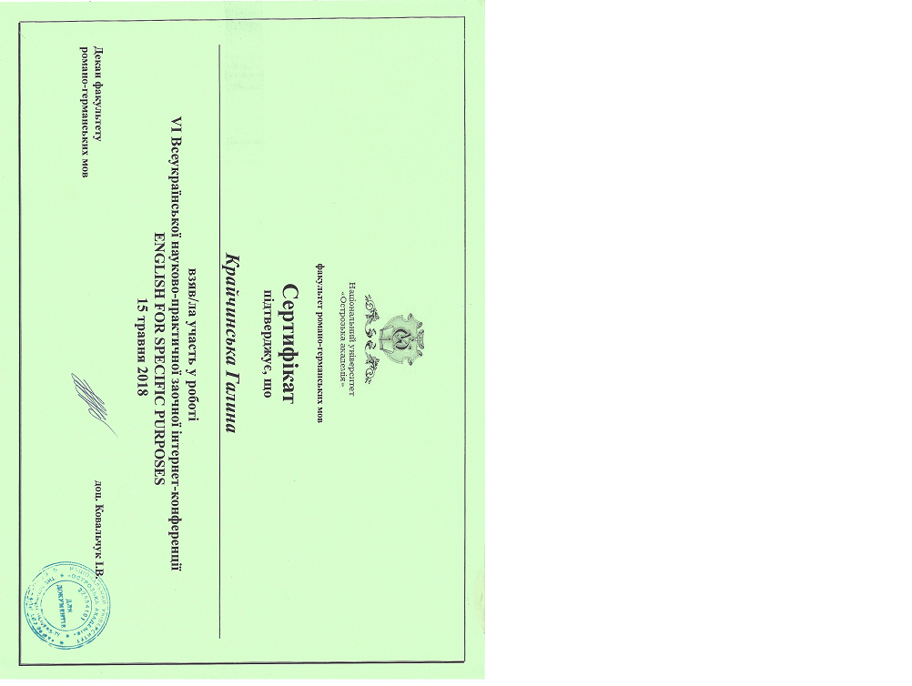 English for Specific Purposes: збірник наукових тез / Ред. кол.: Г. В. Крайчинська, І. В. Ковальчук, Д.М. Шевчук. – Острог : Видавництво Національного університету «Острозька академія», 2018. – Випуск 5. – 167 с.