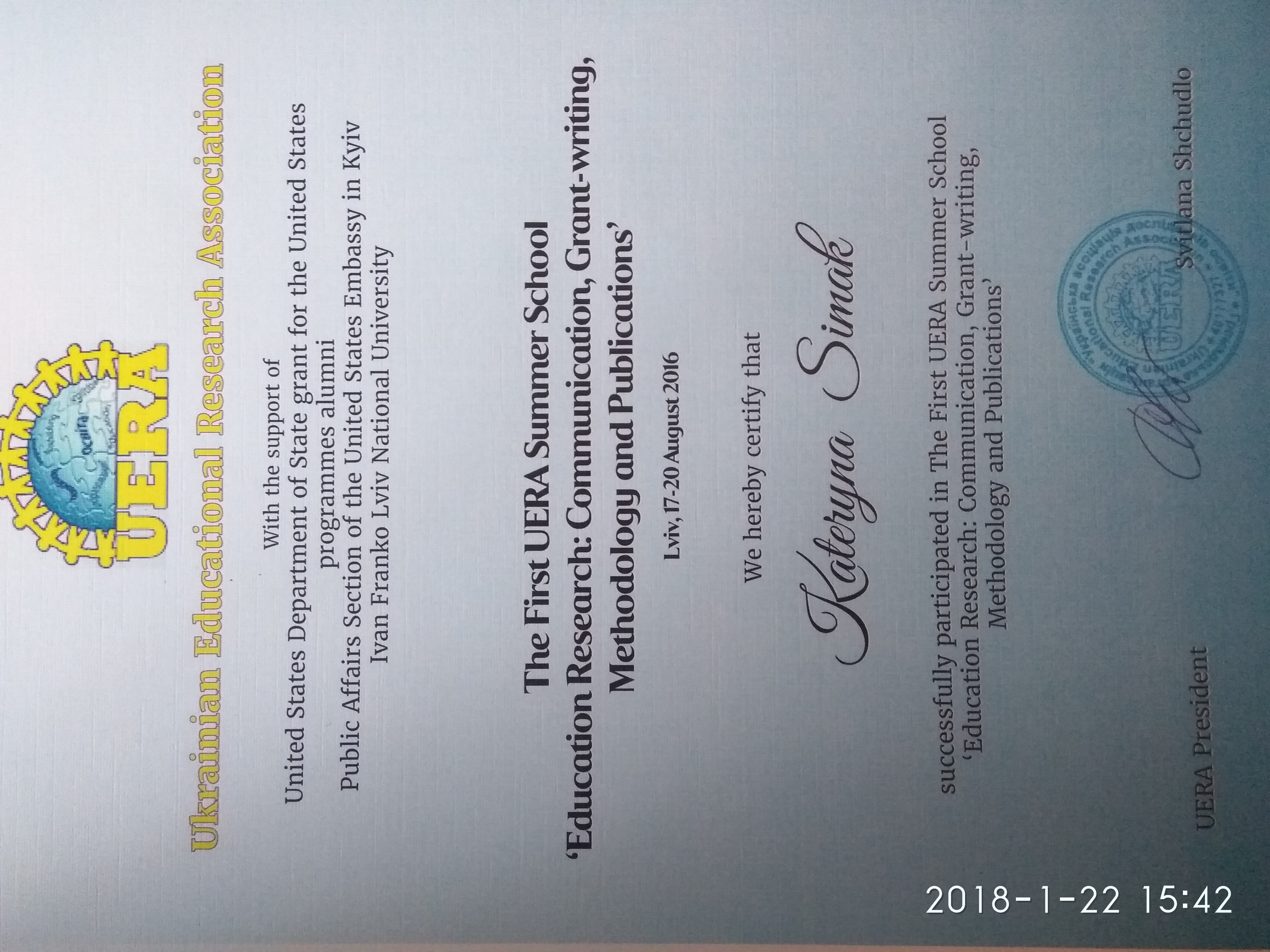 Впродовж 2016 року була учасницею «Школи дослідника-компаративіста – 2016», організованої Відділом порівняльної педагогіки Інституту педагогіки НАПН України.