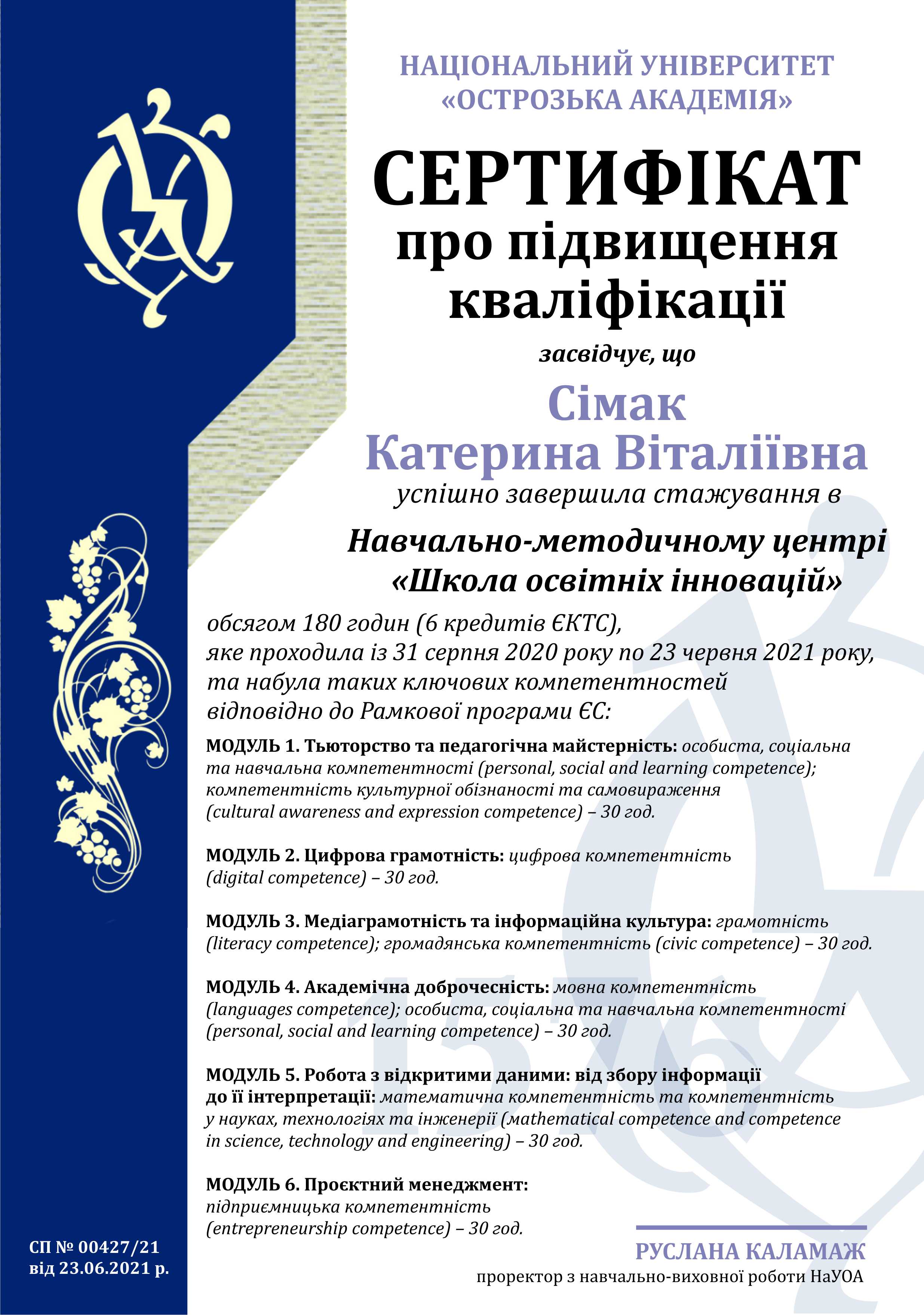 Сімак К.В., Сімак О.Ю., Сімак О.В. Вебінар як засіб підвищення професіоналізму сучасного педагога / К.В. Сімак, О.Ю. Сімак, О.В. Сімак // Нова педагогічна думка : наук. – метод. журн. / Рівнен. обл. ін.-т післядипл. пед. освіти , Рівнен. держ. гуманітар. ун-т. – Рівне, 2021. – №3. – (подано до друку).
