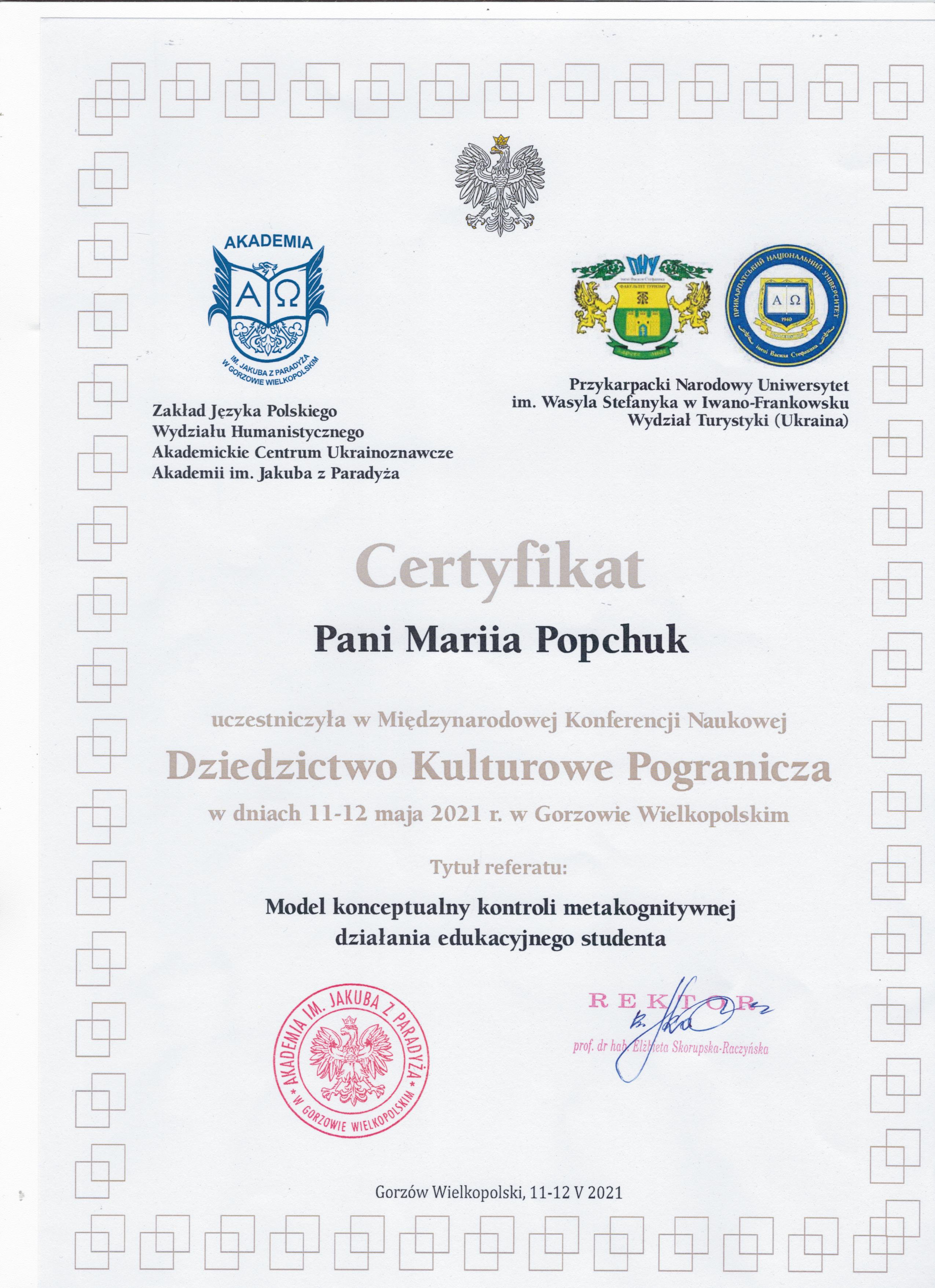 Попчук М.А. Концептуальна модель метакогнітивного контролю навчальної діяльності студентів. Międzynarodowa Konferencja Naukowa DZIEDZICTWO KULTUROWE POGRANICZA. Akademia im. Jakuba z Paradyża (Gorzów Wielkopolski)
