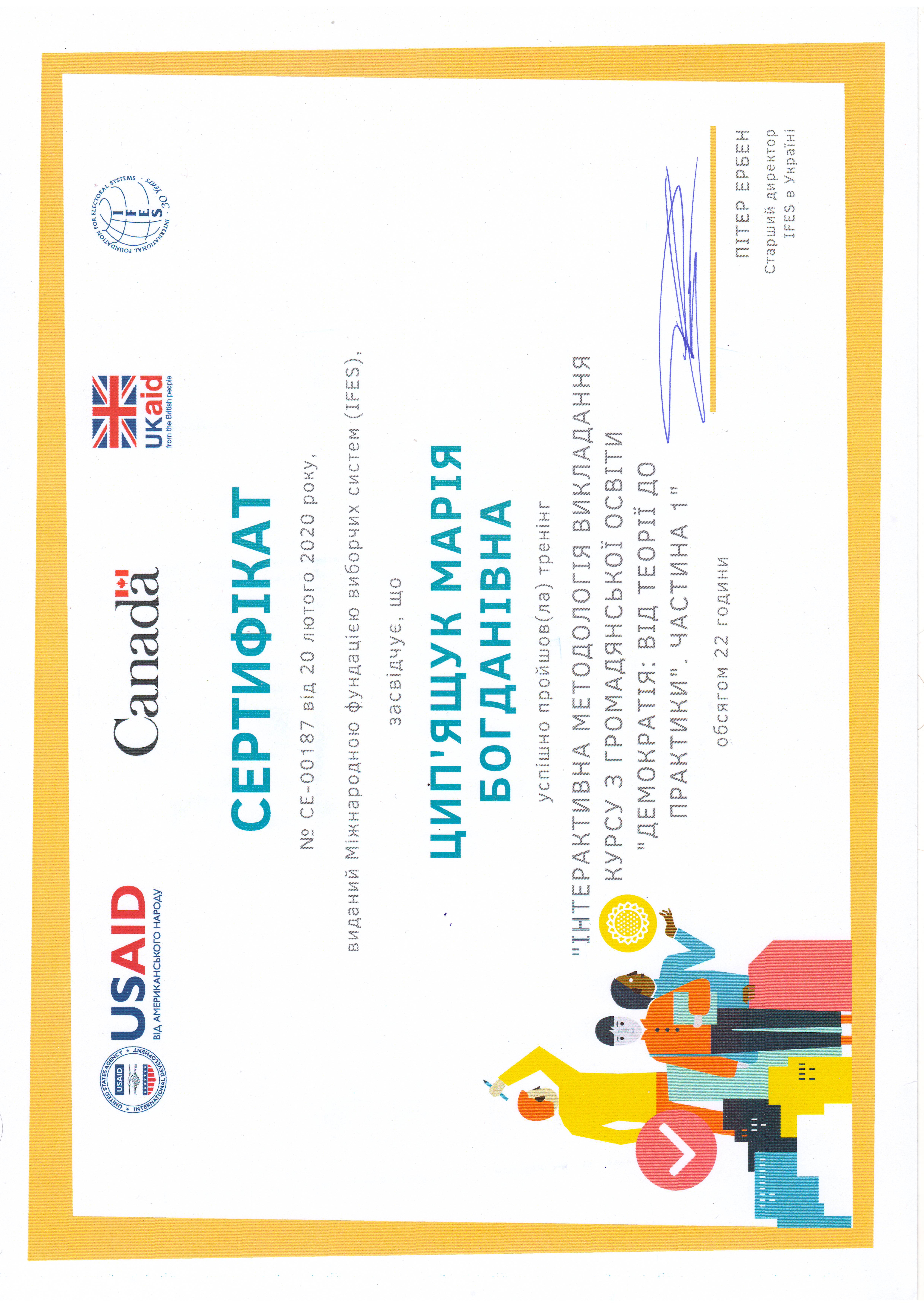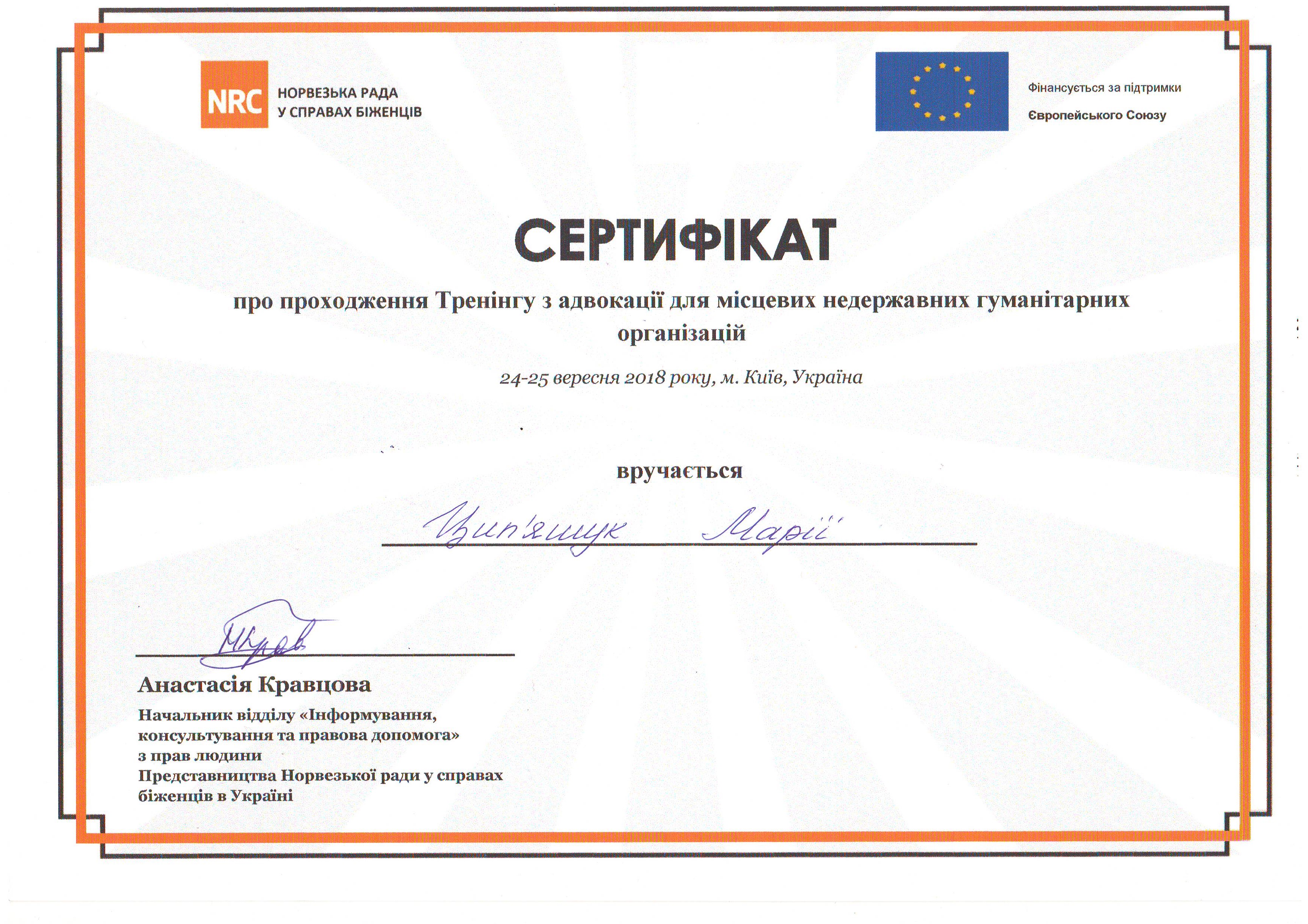 - Тренерка “Тренінгу для тренерів” для Мережі центрів громадського контролю “ДІЙ” в Україні Міжнародної організації “Людина в біді” (“People in Need”) – 03-04 грудня 2019 року