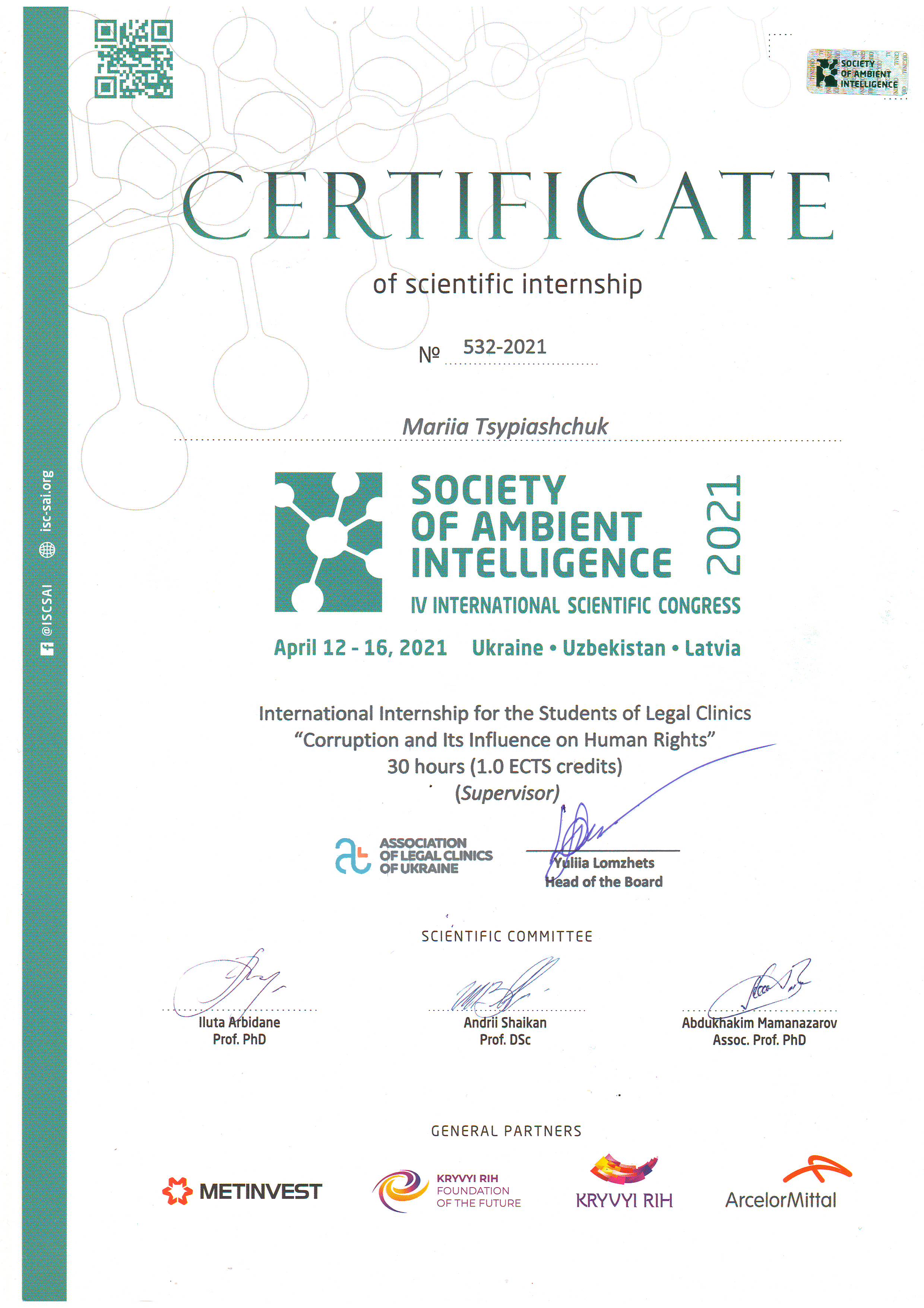 Підготовка тез, відеопрезентація та доповідь на Всесвітній онлайн-конференції юридичних клінік (Global Alliance for Justice Education, the International Journal of Clinical Legal Education and the Association for Canadian Clinical Legal Education and hosted by the the Northumbria University (UK)) (18.06.21). Доповідь на тему: "Street Law Practice in Ukraine: Legal Clinical Activity Context"
