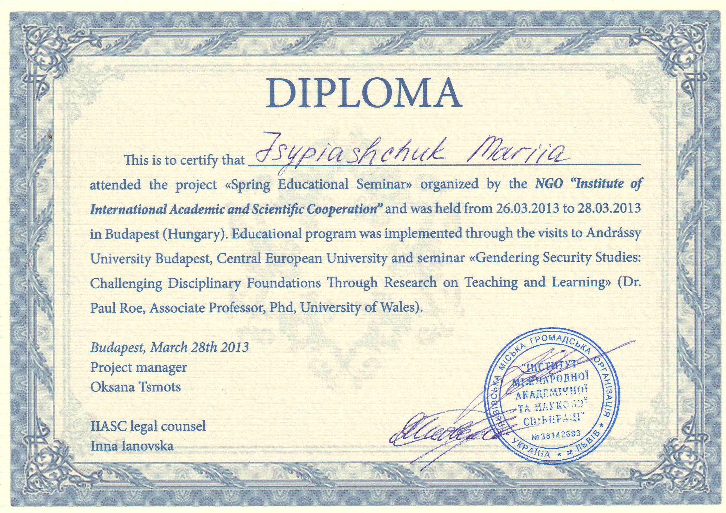 Диплом про участь у весняному освітньому семінарі. Будапешт, Угорщина. - 28.03.2013 (0,61 Мб).