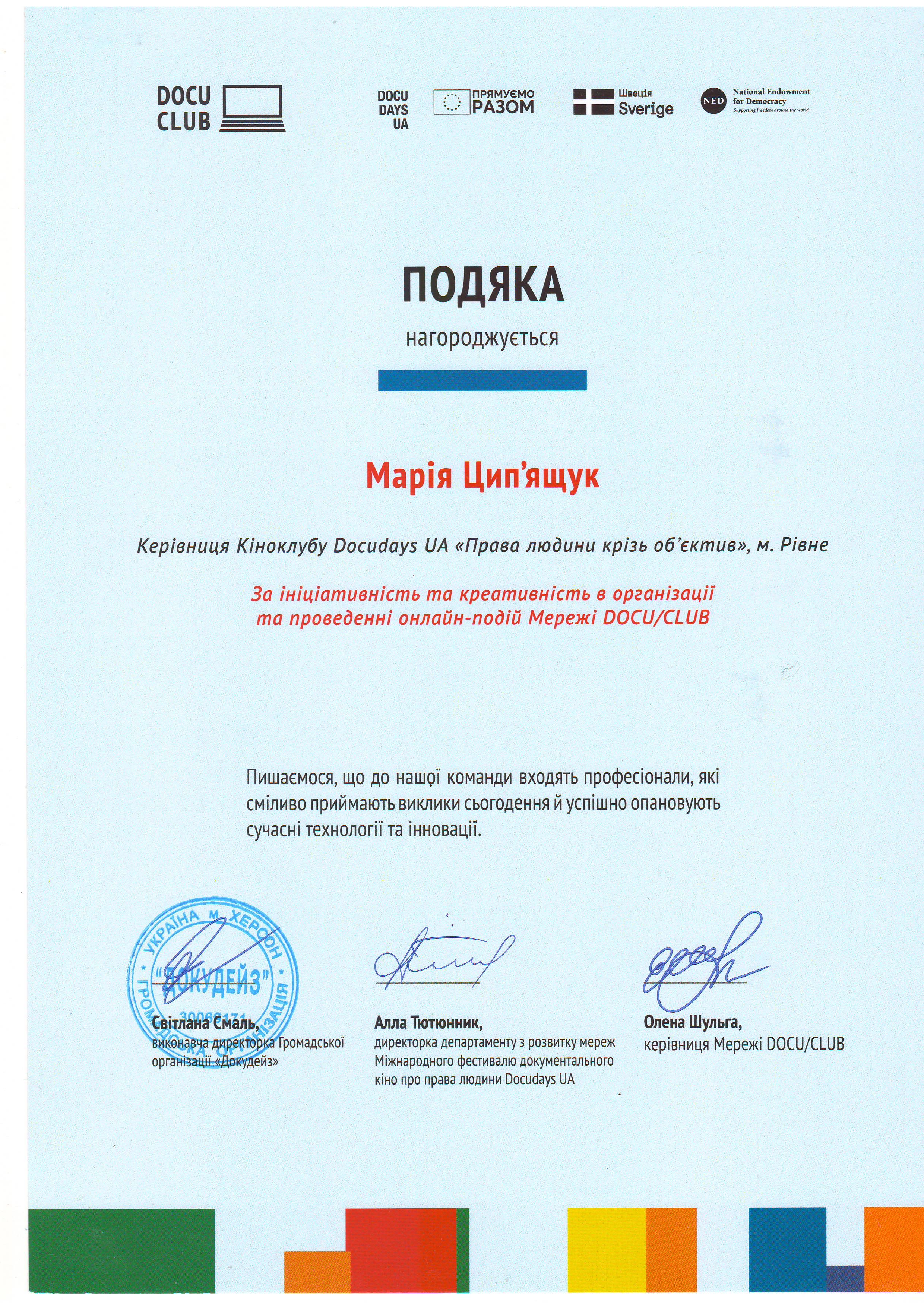 З 2015 року є модераторкою Рівненського Docu/Клубу Міжнародного кінофестивалю документального кіно про права людини Docudays UA “Права людини крізь об’єктив”; У 2017 році - регіональна координаторка мандрівної виставки “Кожен має право знати свої права”, 2016. Тренерка для нової патрульної поліції України з прав людини та попередження дискримінації у 2016 та 2017 роках.