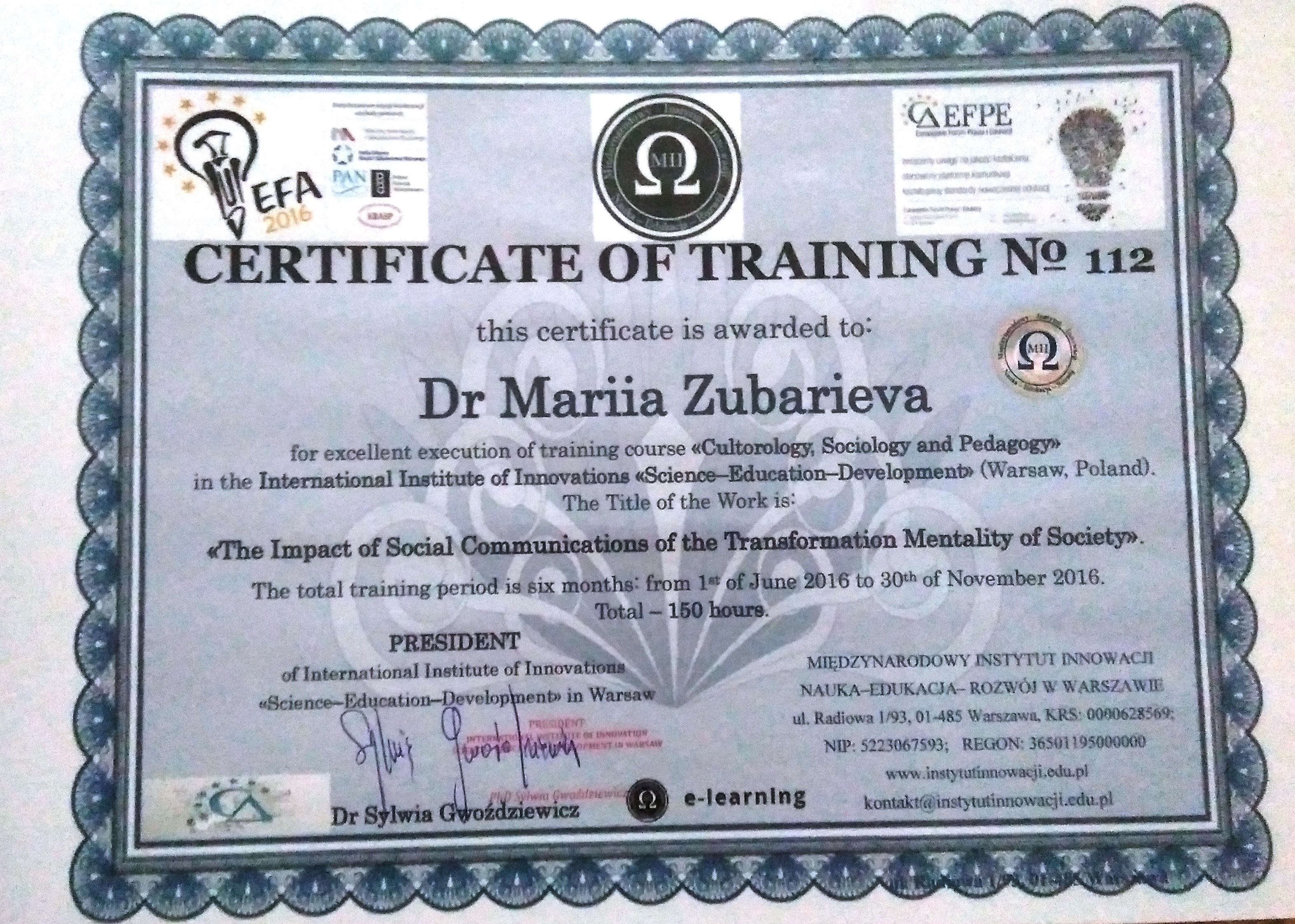 Зубарєва М. Вплив соціальних комунікацій на трансформацію ментальності суспільства. Training course “Cultorology, Sociology and Pedagogy” in the International Institute of Innovations “Science – Education-Development”. (1 червня -30 листопада 2016 р., м. Варшава).