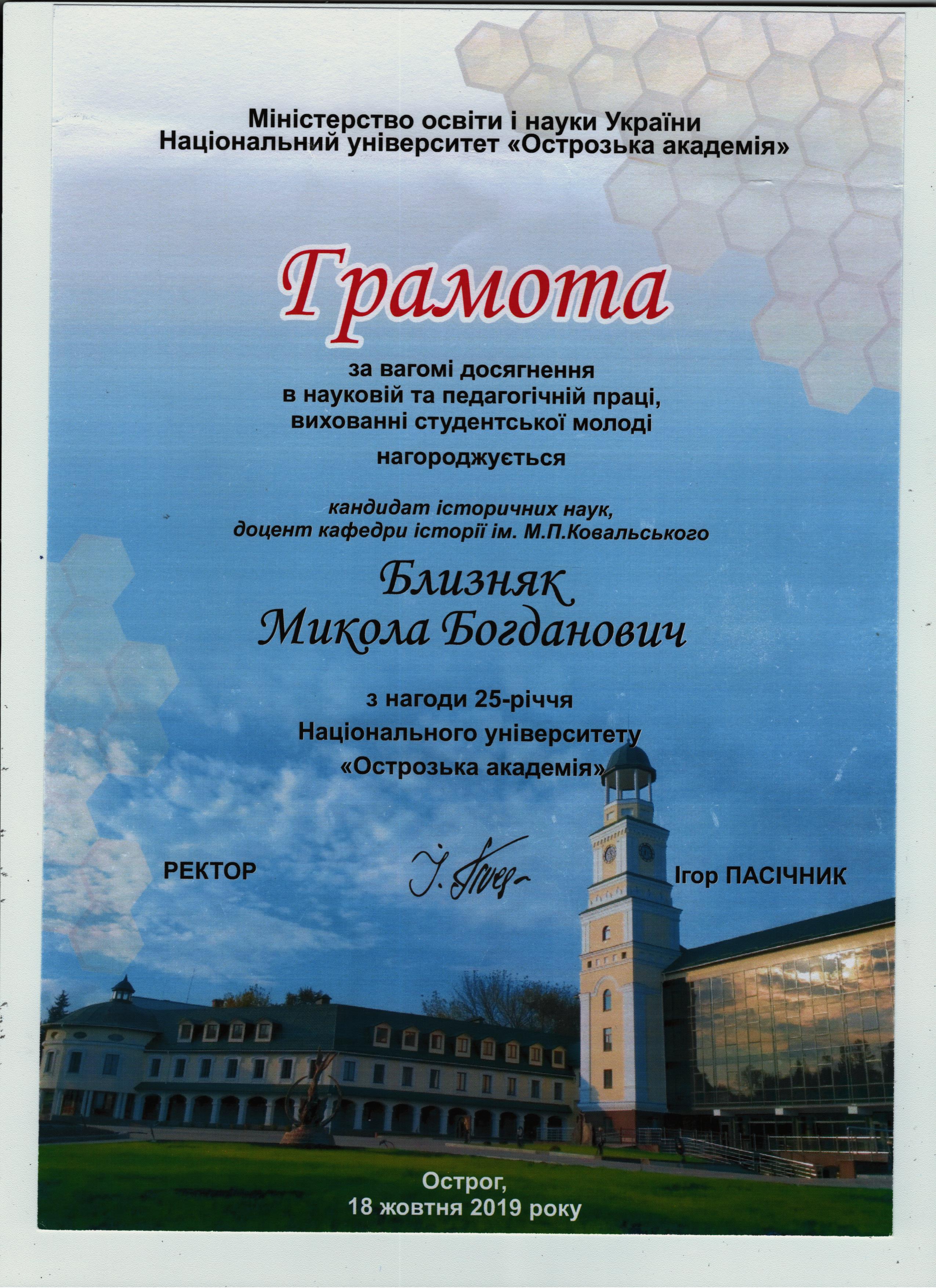 Близняк М. Кафедра історії ім. проф. М. Ковальського // Острозька академія: історія та сучасність культурно-освітнього осередку. Енциклопедичне видання / За ред. І. Пасічника, П. Кралюка, Д. Шевчука та ін. Вид. 3-є, доп. і переробл. Острог: Вид-во Острозька академія, 2019. С. 654 – 657. (у співавторстві з А. Атаманенко, В. Трофимовичем)