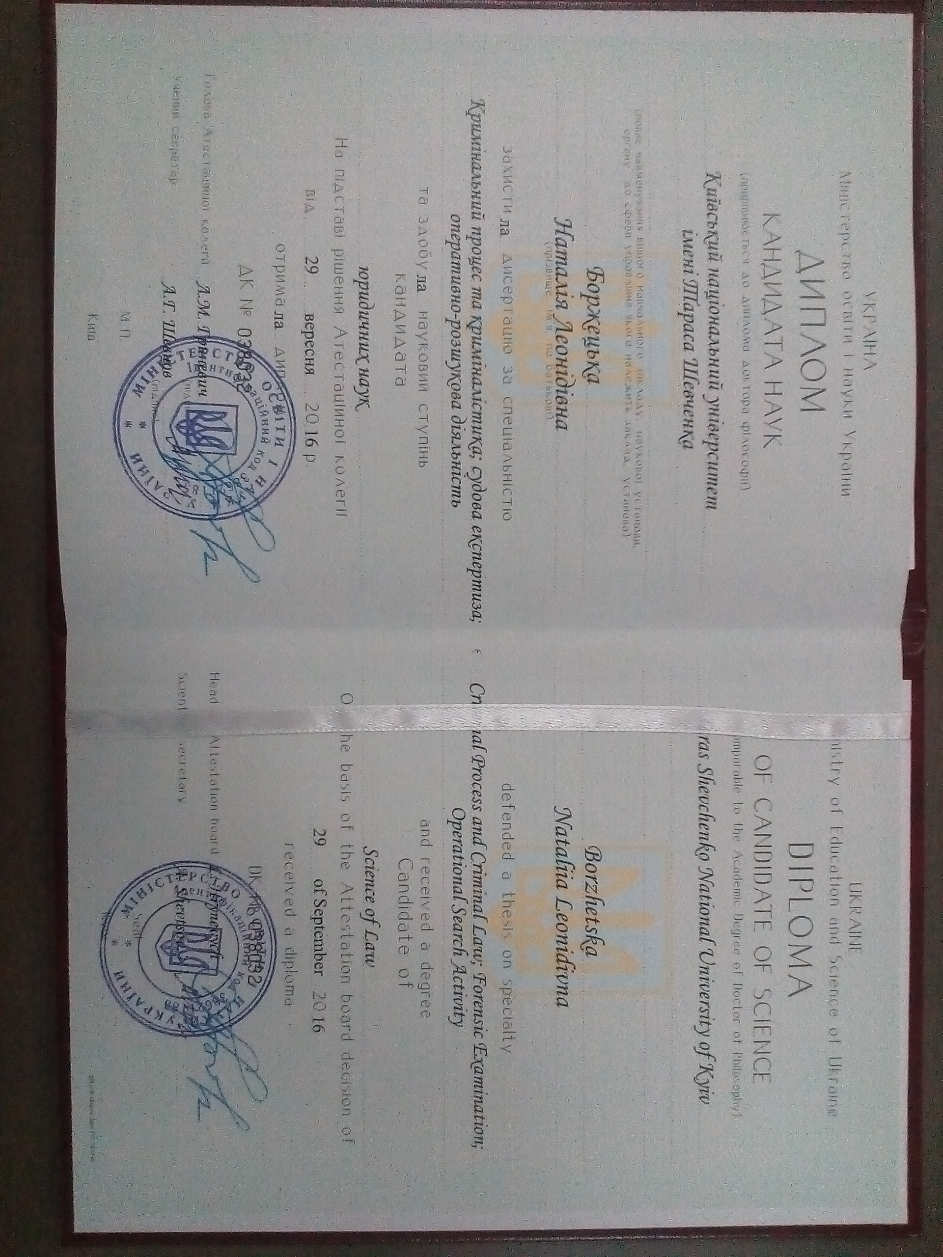 Диплом кандидата юридичних наук ДК № 038032 від 29 вересня 2016 р. - 29.09.2016 (1,82 Мб).