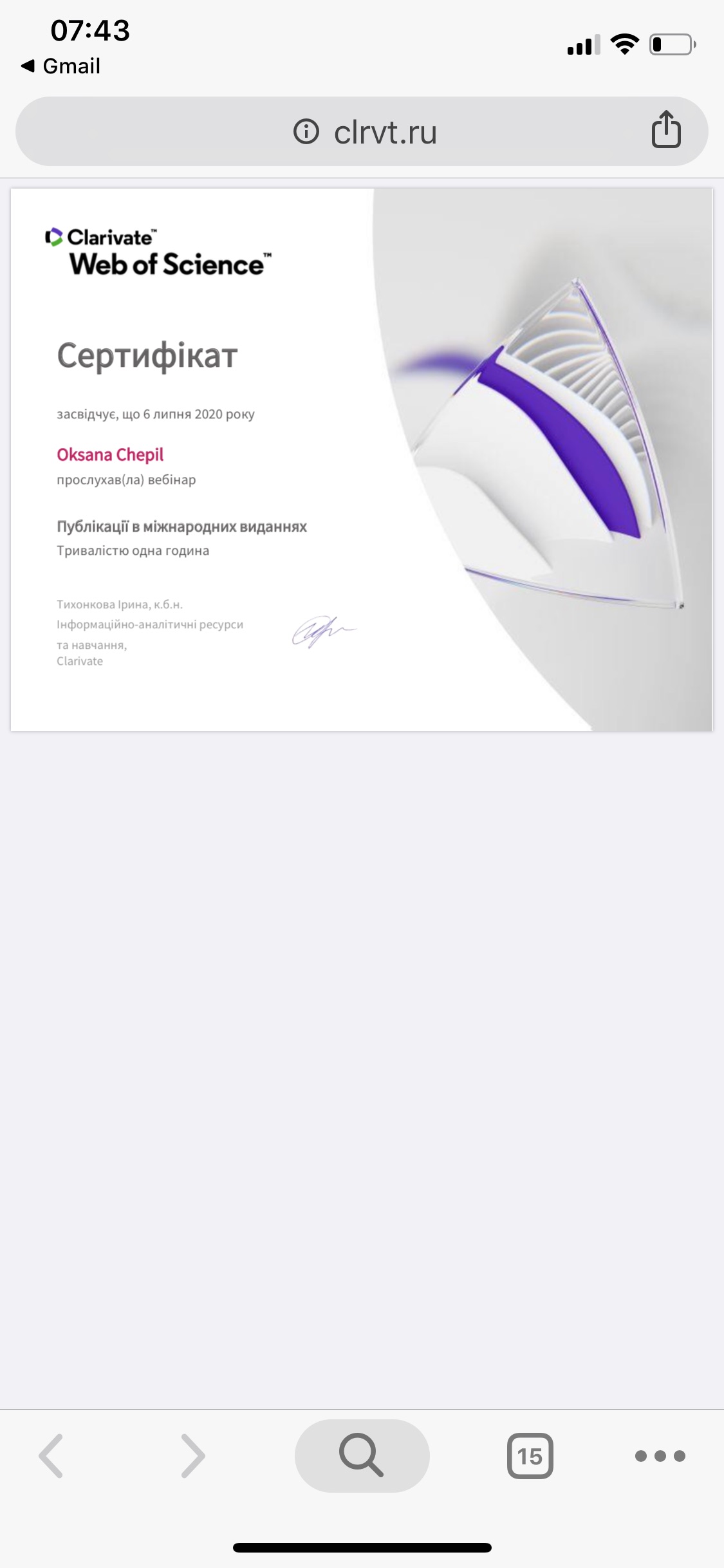 Clarivate, Web of Science, « Публікації в міжнародних виданнях». - 06.07.2020 (0,14 Мб).