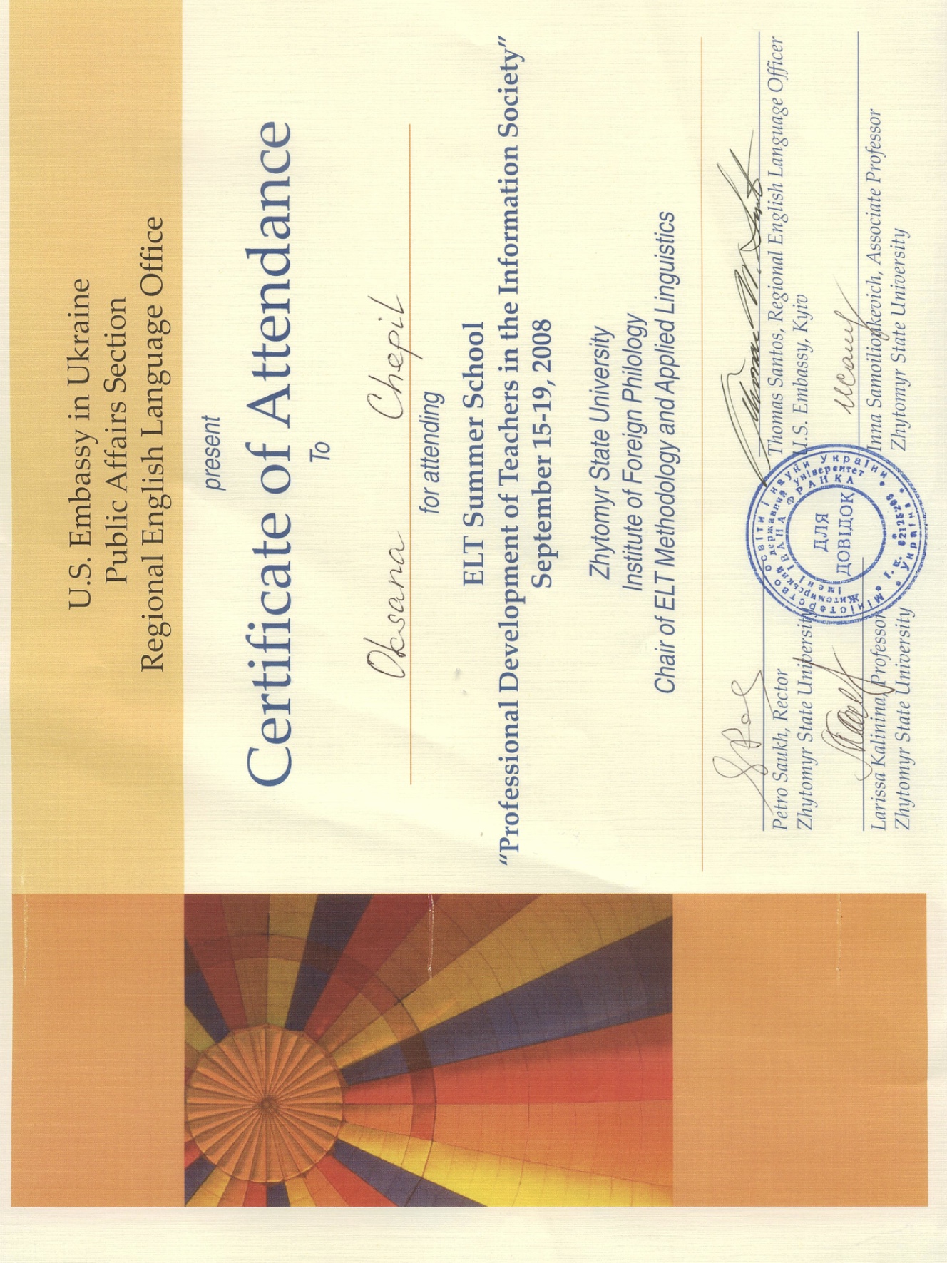09/2008 internship at international ELT Summer School “Professional Development of Teachers in the Information Society”, organized and supported U.S. Embassy in Ukraine, Public Affairs Section, Regional English Language Office.