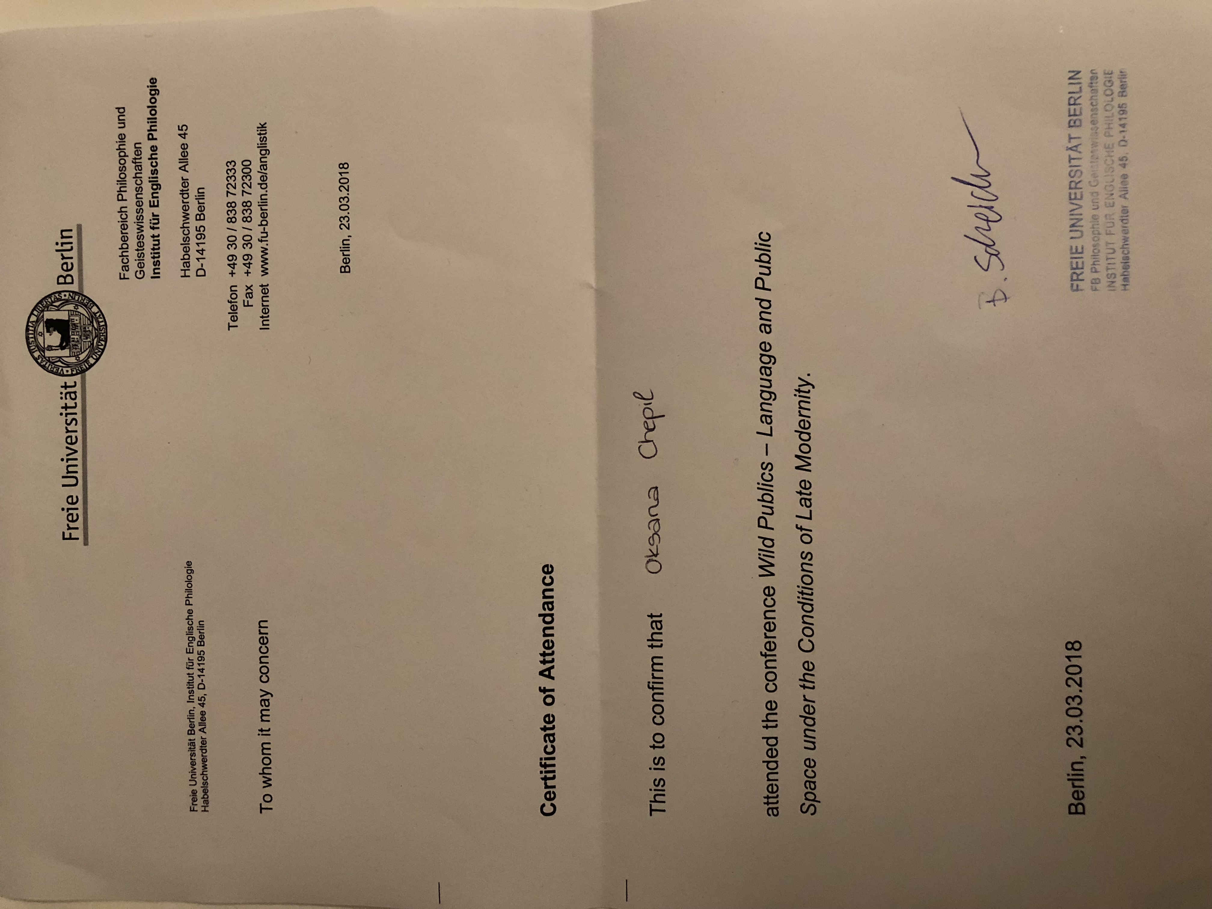 Участь у міжнародній конференції at Frei Universität, Berlin, Germany, 23-24 березня, 2018; «Wild Publics: Language in Public Space under the Conditions of Late Modernity.»