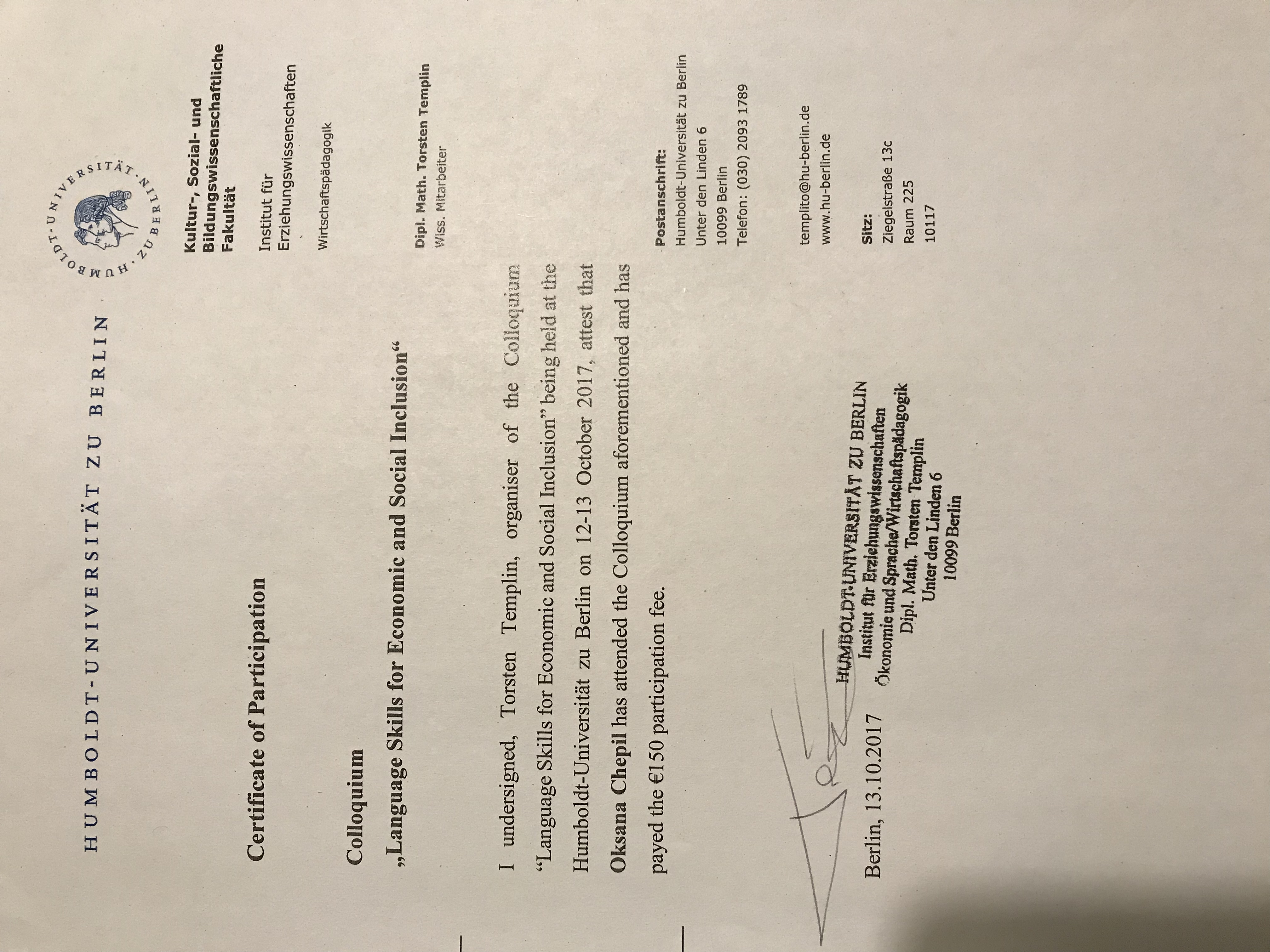 Участь в роботі міжнародного форуму "Language Skills for Economic and Social Inclusion“ , Humboldt Universität, Berlin, 12-13 жовтня, 2017р.