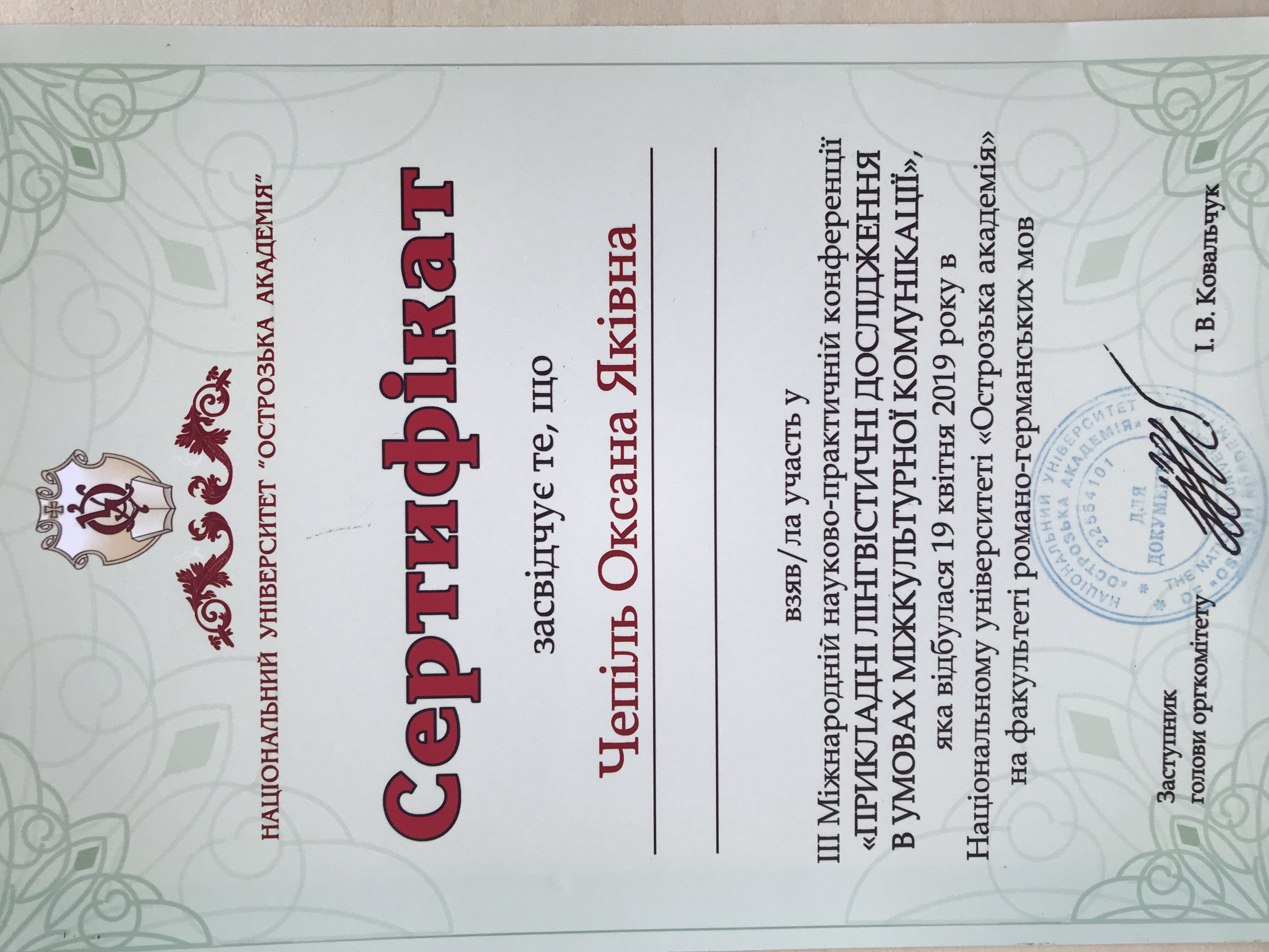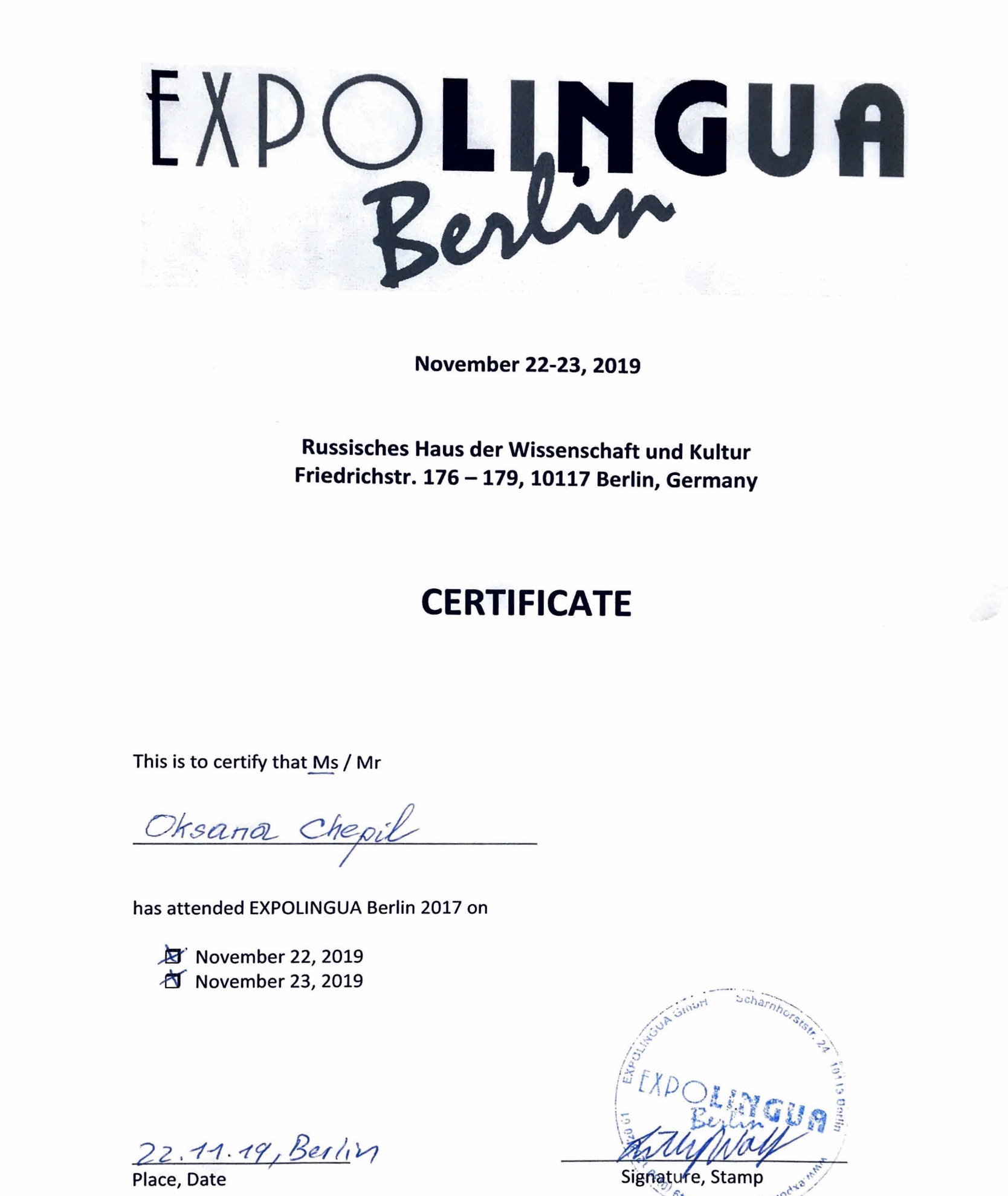 Участь у роботі науково-практичних семінарів під час роботи 32-ї міжнародної виставки з вивчення ІМ та культур, Expo lingua, Berlin. «From digital to my digital : how to choose digital tools for your language classes Cambridge Assessment English»; «How to become a language YouTuber and online language teacher!»; « Prepare for your TOEFL and benefit from 2019 improvements “; “New language learning apps- meet innovative projects!”; “Computer assisted translation with SDL Tradis Studio”.
