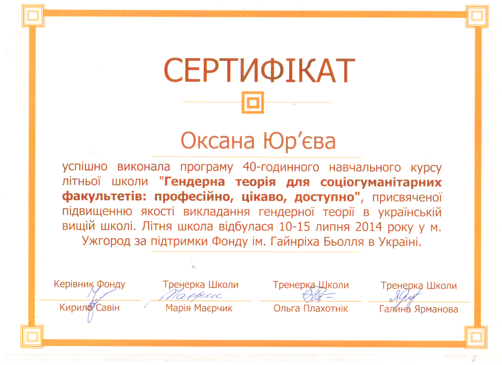 Юр’єва О. Ю. Порівняльно-педагогічний аналіз реалізації гендерної освіти бакалаврів гуманітарних спеціальностей у вищих навчальних закладах України та Канади / О. Ю. Юр’єва // Гуманітарний вісник ДВНЗ «Переяслав-Хмельницький державний педагогічний університет імені Григорія Сковороди» : зб. наук. праць. – К. : Гнозис, 2013. – Дод. 1 до вип. 31, т. І (43) Темат. вип. «Вища освіта України у контексті інтеграції до європейського освітнього простору» / відп. ред. І. П. Маноха. – С. 469–478.
