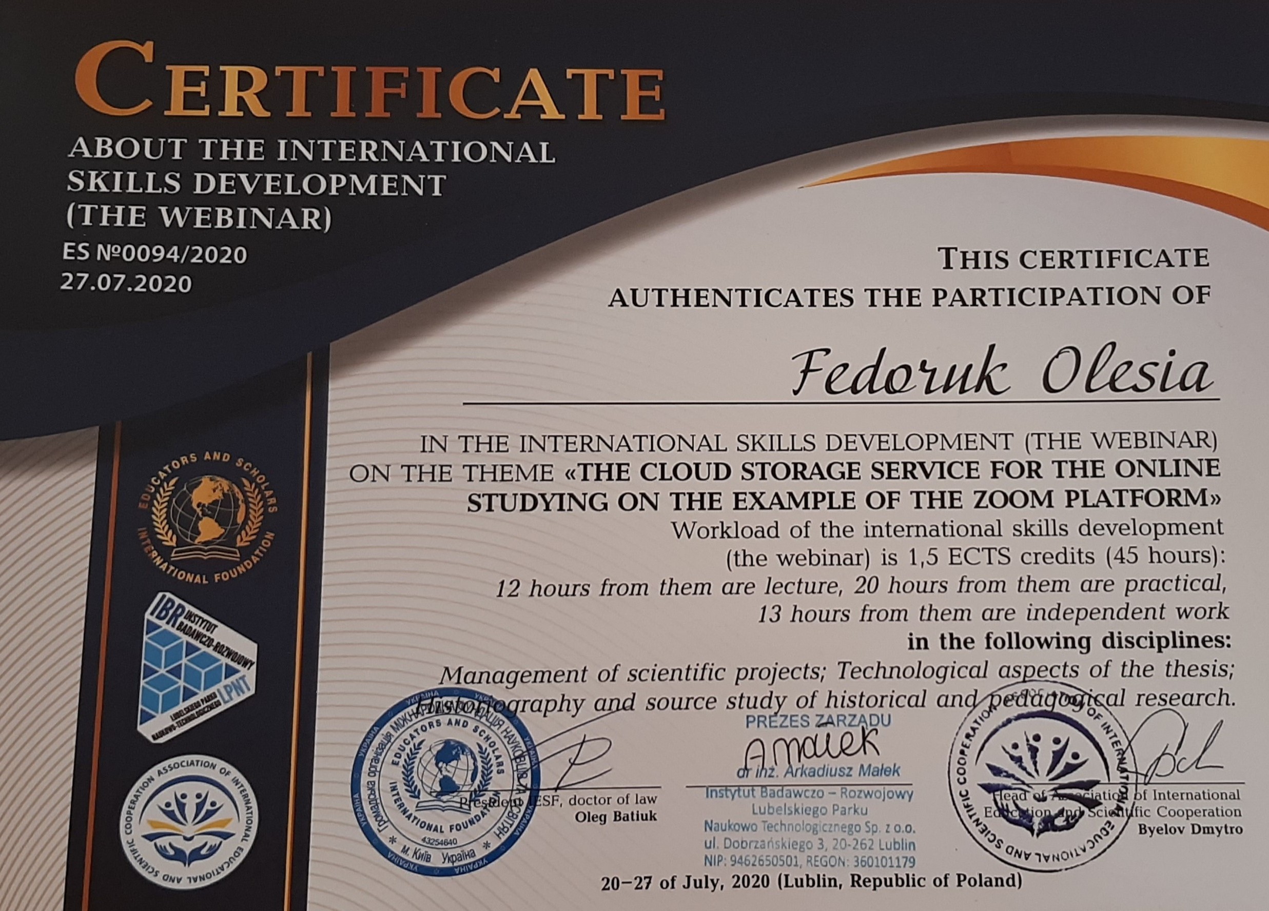 Федорук О. М. Формування документознавця як фахівця. Суспільні дисципліни як засіб формування цивілізаційної компетентності здобувачів освіти: матеріали Всеук. наук.-практ. конференції (м. Рівне, 27-28 квіт. 2018). Рівне, 2018. С. 208–212.