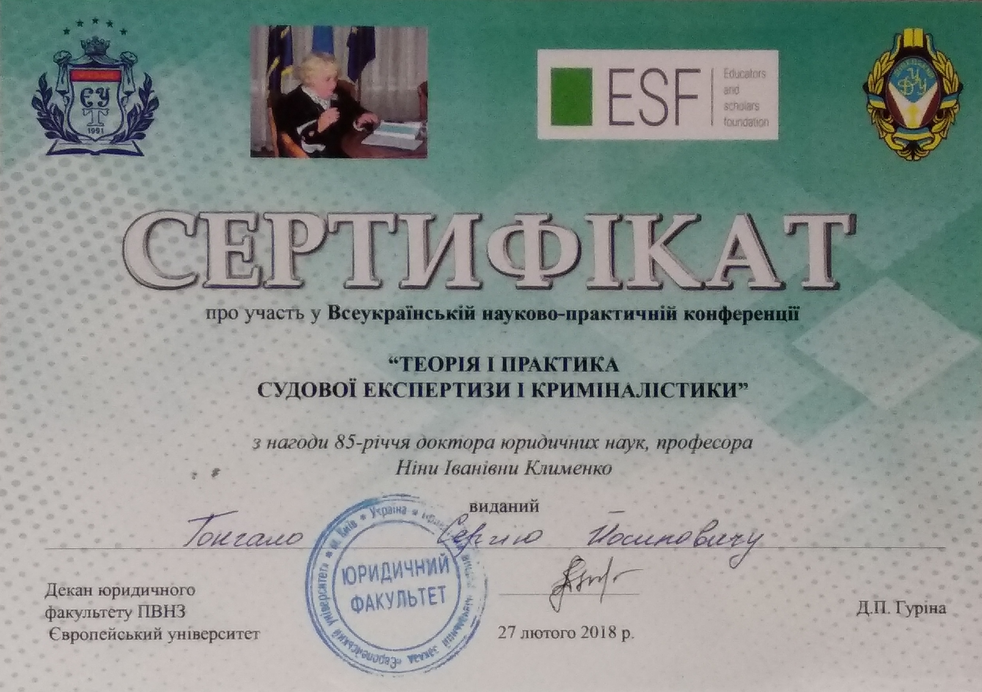 Сертифікат про участь у Всеукраїнській науково-практичній конференції "ТЕРІЯ І ПРАКТИКА СУДОВОЇ ЕКСПЕРТИЗИ І КРИМІНАЛІСТИКИ" з нагоди 85-річчя доктора юридичних наук, професора Ніни Іванівни Клименко - 27.02.2018 (1,88 Мб).