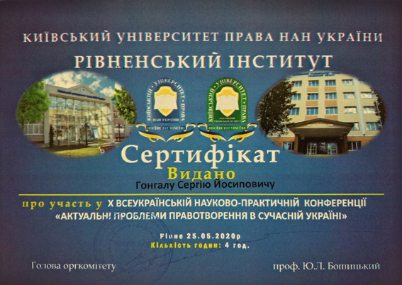 Сертифікат учасника X Всеукраїнської навчально-наукової конференції «Актуальні проблеми право творення в сучасній Україні» (м. Рівне, Рівненський інститут КУП НАНУ 25 травня 2020 р.) - 25.05.2020 (0,18 Мб).