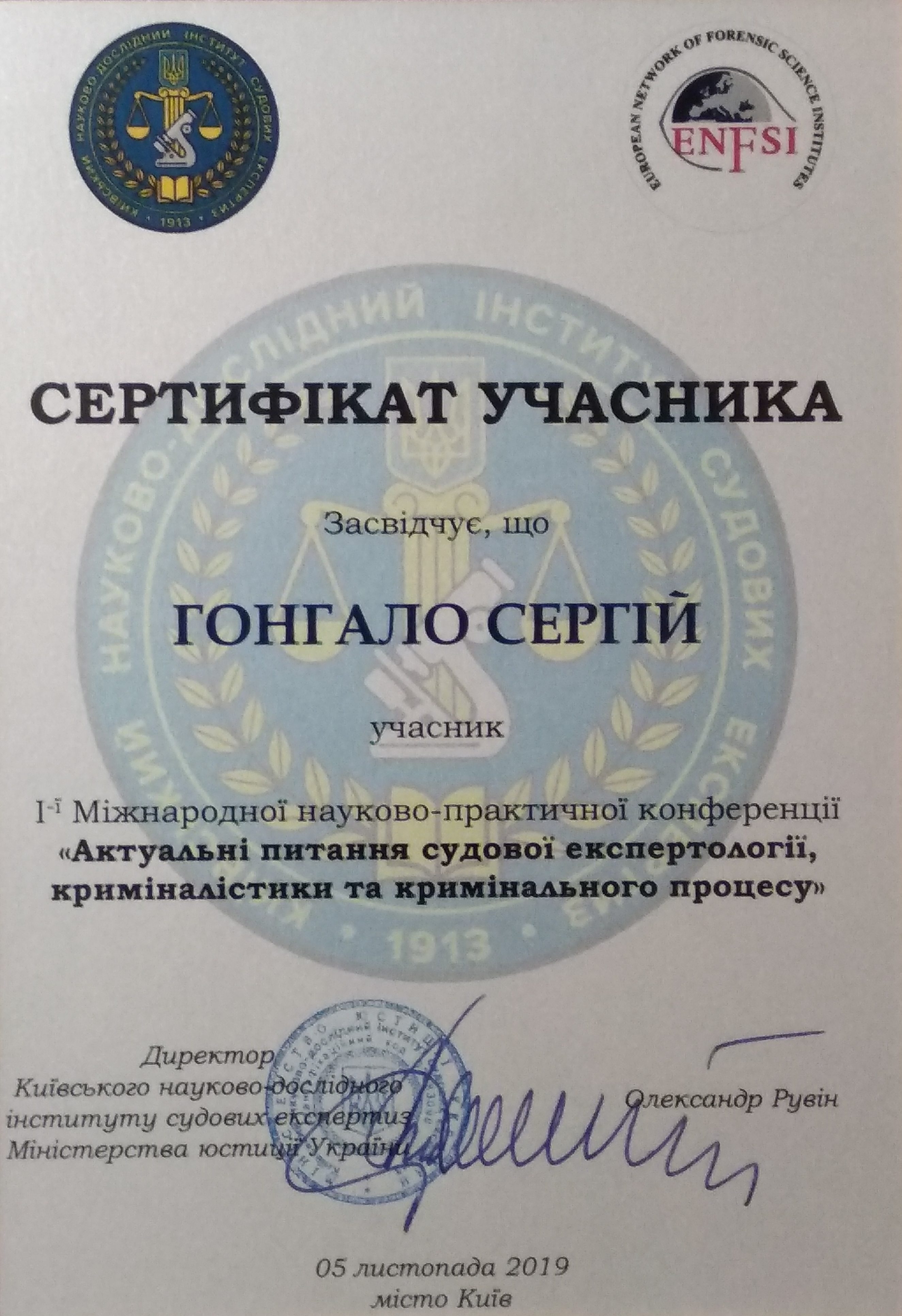 Сертифікат учасника I-ї Міжнародної науково-практичної конференції "Актуальні питання судової експертології, криміналістики та кримінального процесу" - 05.11.2019 (2,45 Мб).