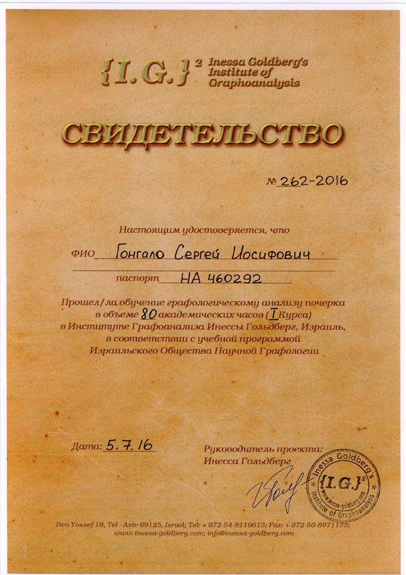 Свідоцтво № 262-2016 від 05.07.2016 р. про проходження 80-ти годинного курсу навчання графологічному аналізу почерку в Інституті графоаналізу Інеси Гольдберг, Ізраїль, у відповідності з навчальною програмою Ізраїльського Товариства Наукової Графології. - 05.07.2016 (0,39 Мб).