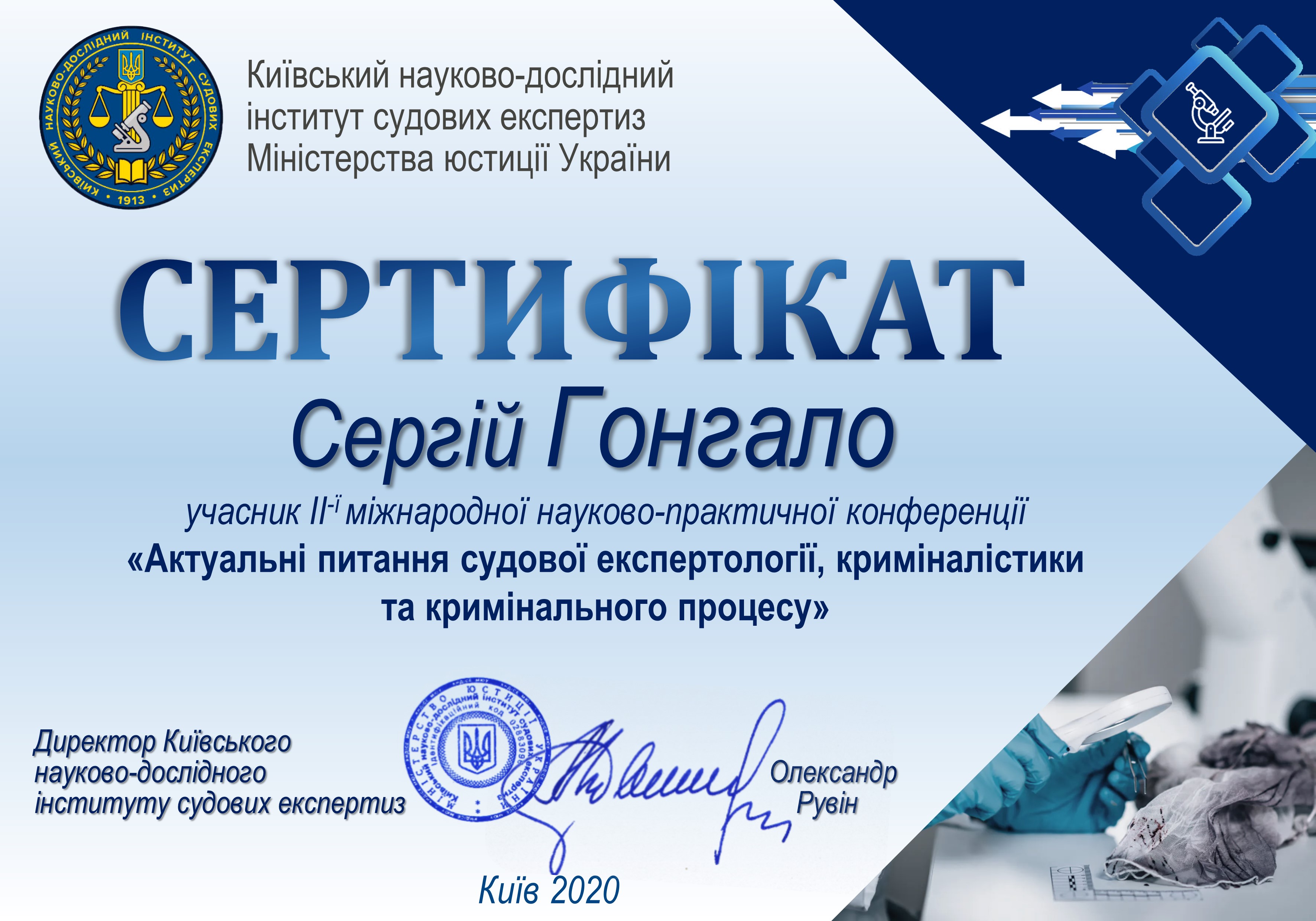 Сертифікат учасника II-ї міжнародної науково-практичної конференції «Актуальні питання судової експертології, криміналістики та кримінального процесу». - 19.11.2020 (0,88 Мб).