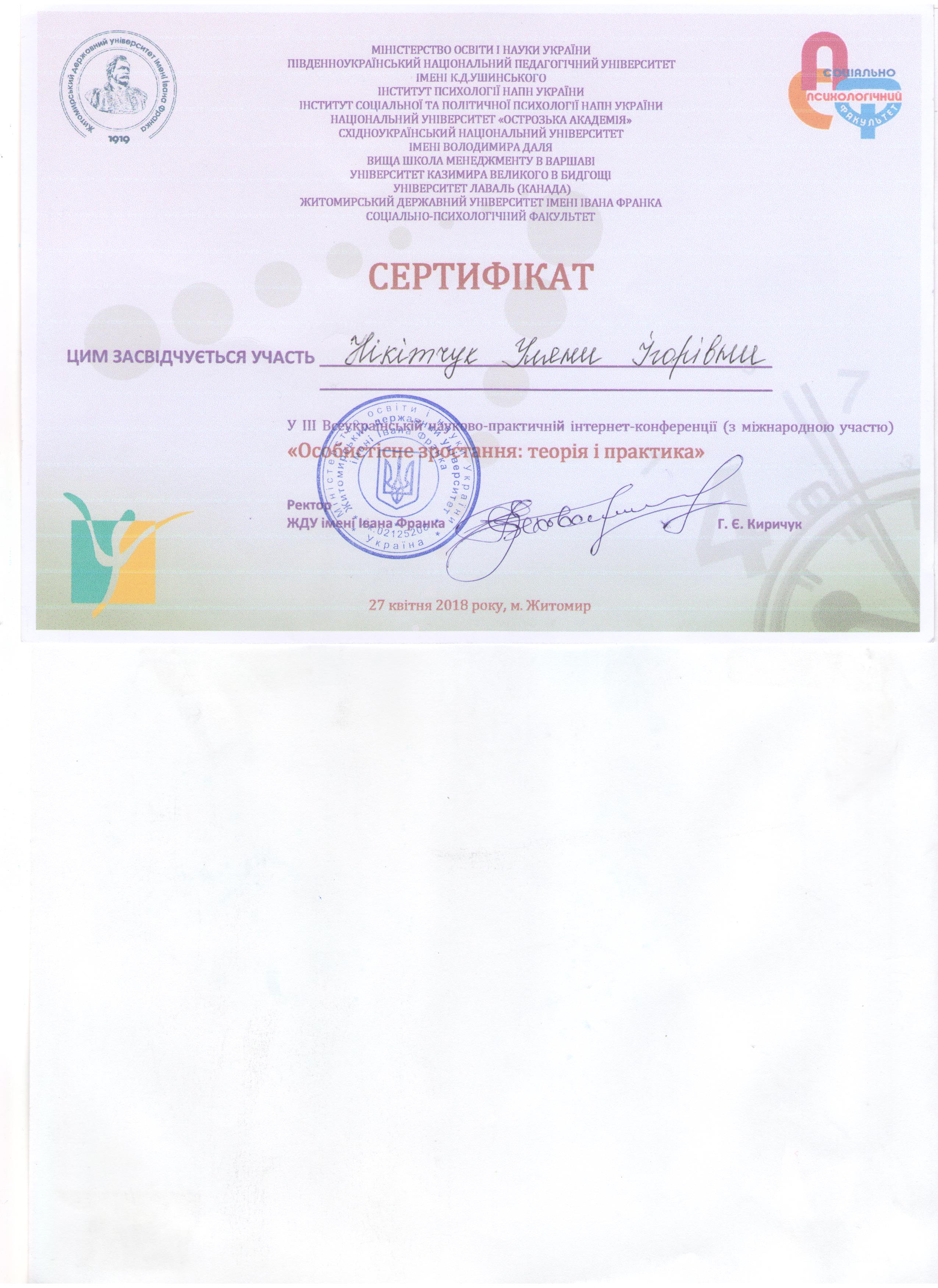Pasichnyk, I. D., Handzilevska, H. B., Nikitchuk, U. I. (2017). Psychological immunity of Ukrainian migrants depending on childhood scenario sets. Psychological Prospects, 30, 145 – 156. (Index Copernicus)