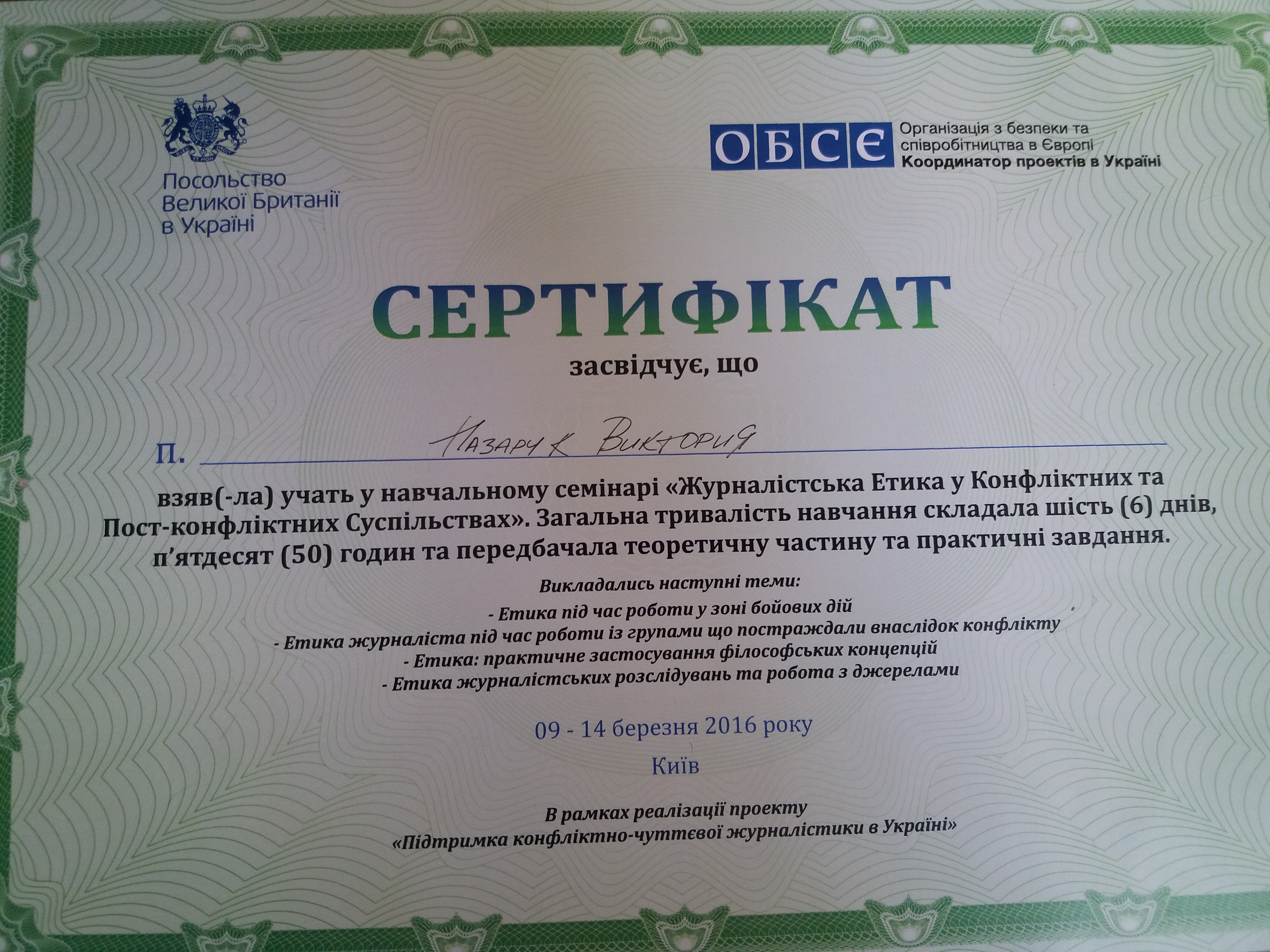 3.Семінар «Журналістська етика в умовах конфліктного та пост-конфліктного суспільства» за підтримки Посольства Великої Британії та ОБСЄ, 9-14 березня 2016, Київ