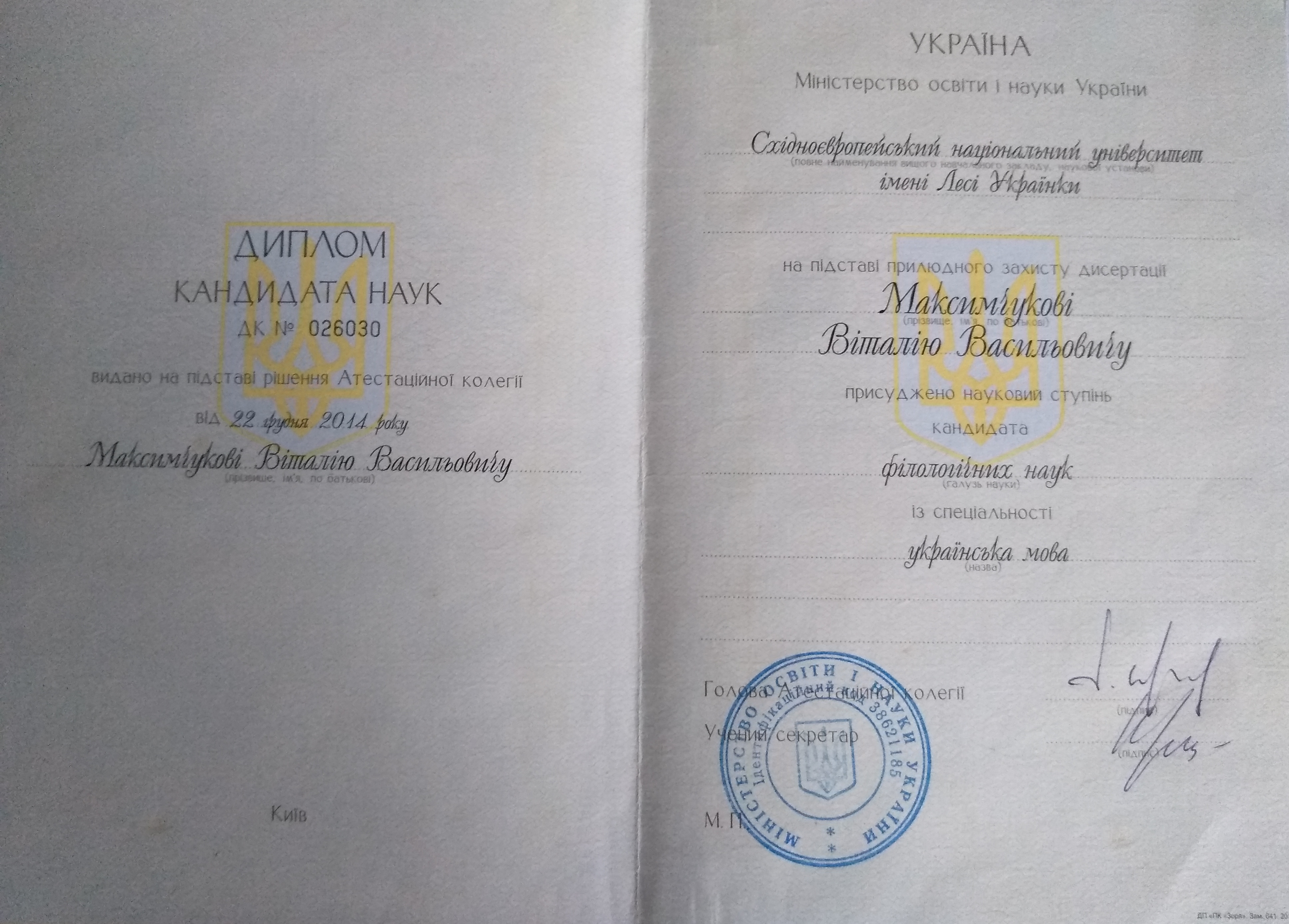 Диплом кандидата наук ДК № 026030 (рішення Атестаційної колегії від 22 грудня 2014 року)