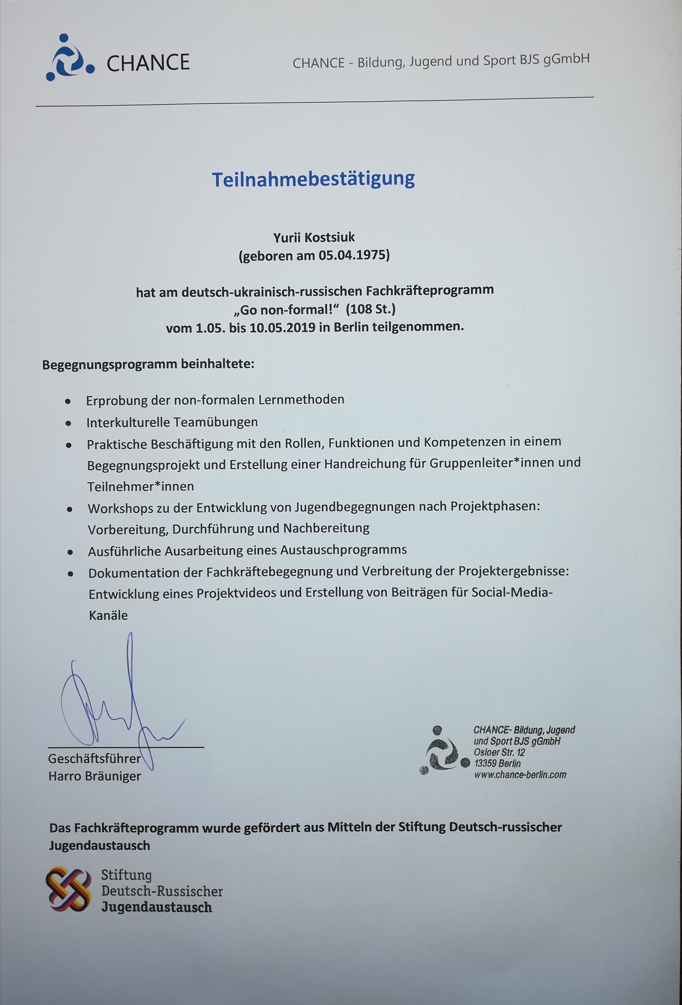 - Львівський державний університет ім. І. Франка за спеціальністю фізика (1992-1997). Спеціаліст фізик. Викладач. Диплом ЛК № 000550 від 23 червня 1997 р.
