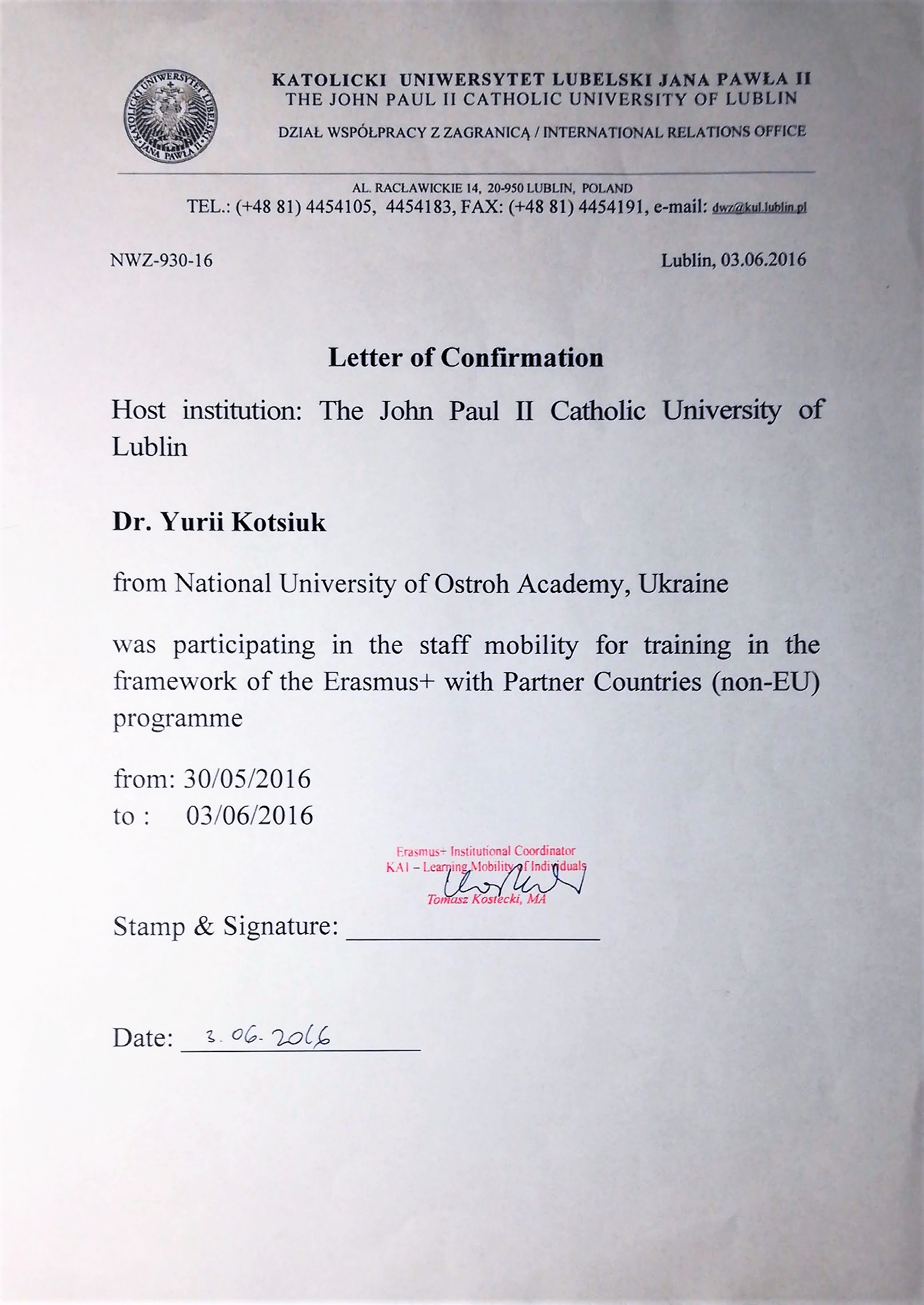 - Національний університет "Острозька академія" спеціальність "Фінанси"; (2003-2004). Спеціаліст з фінансів. Диплом РВ № 25579594 від 19 червня 2004 р.