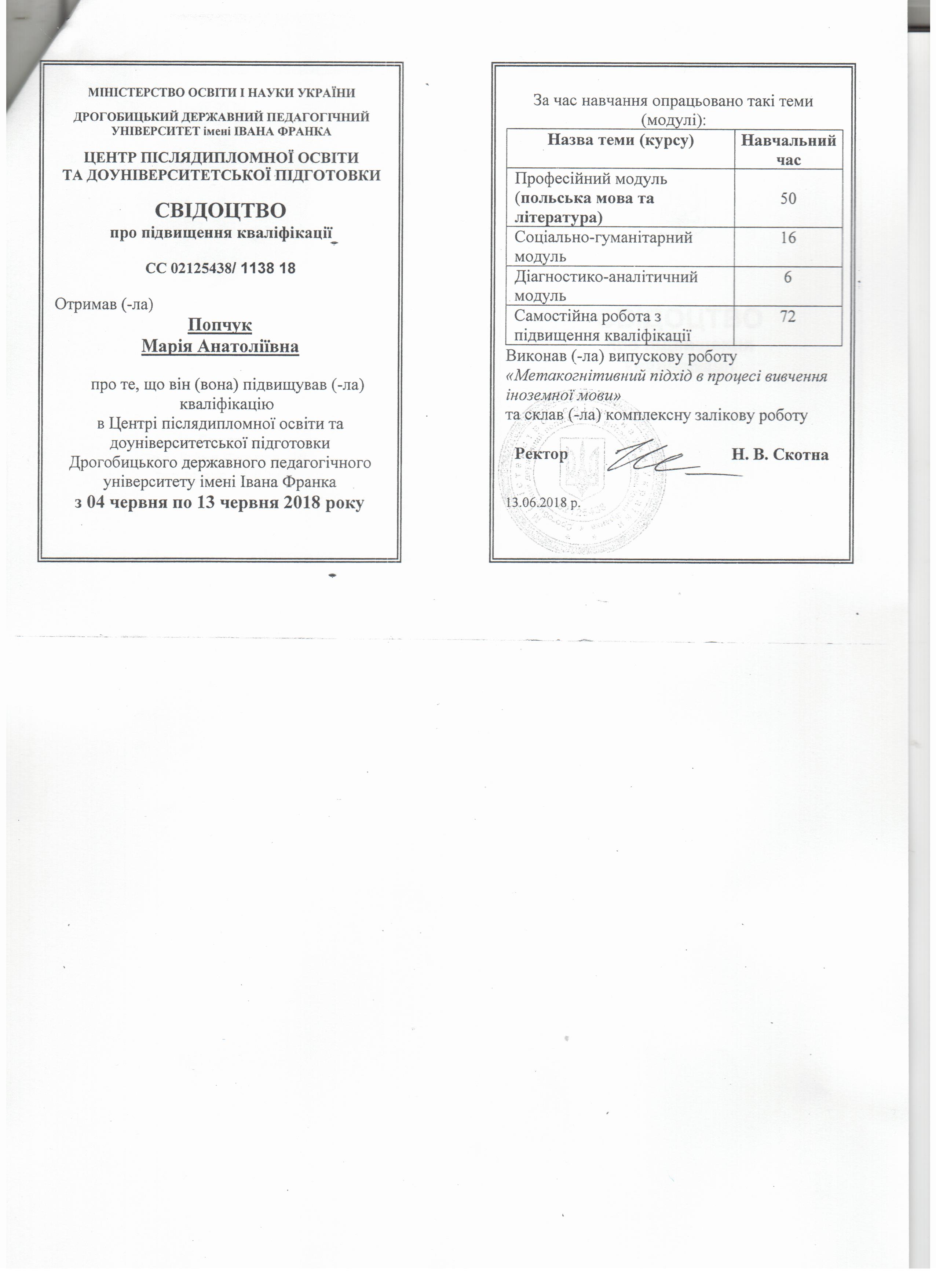 2013-2015 рр. аспірант кафедри психолого-педагогічних дисциплін Національного Університету «Острозька Академія»