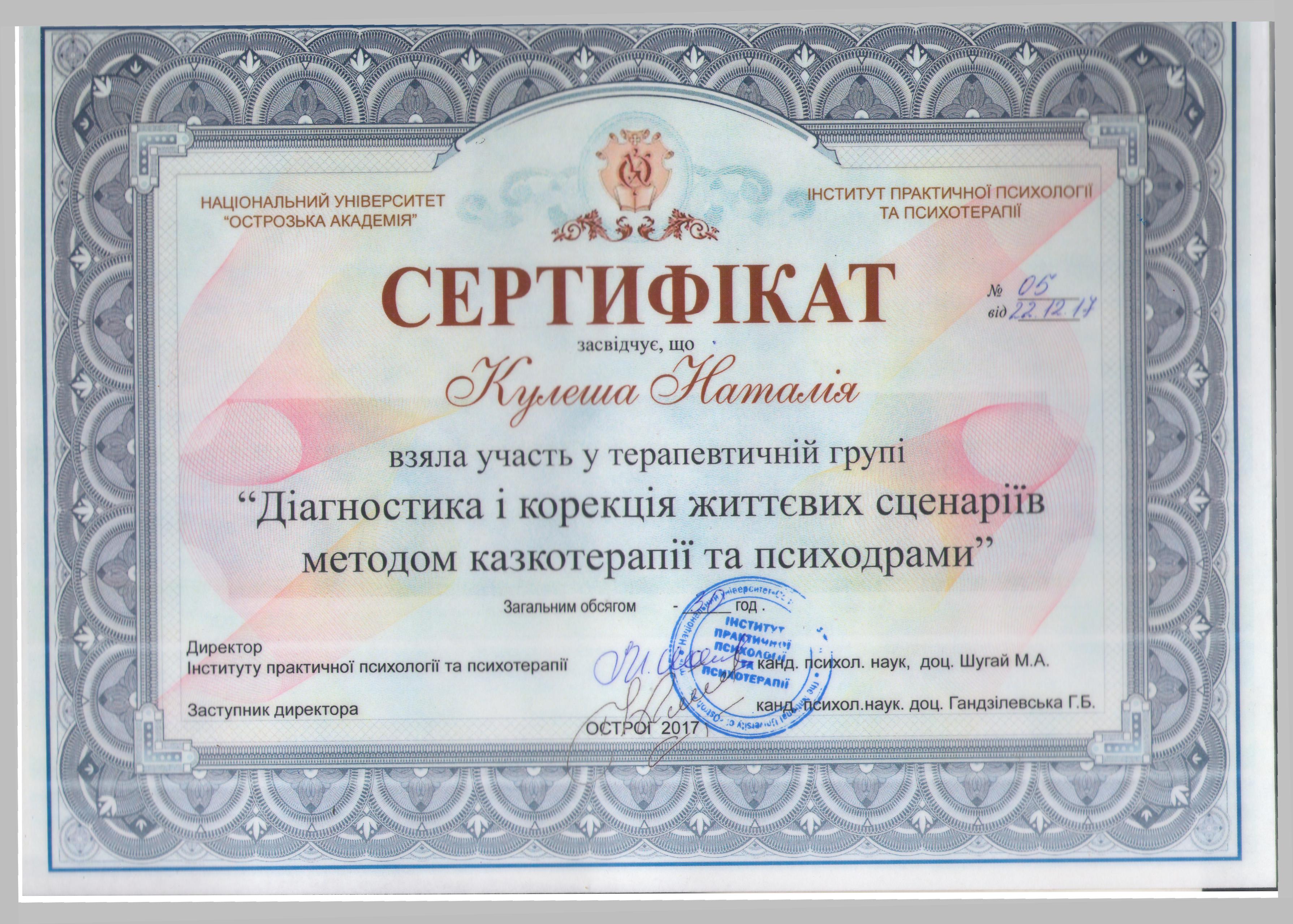 · Навчання в психотерапевтичній групі «Діагностика і корекція життєвих сценаріїв методом казкотерапії та психодрами» (Інститут практичної психології та психотерапії, м. Острог, 2017 р.), сертифікат №5, 22.12.17р.;