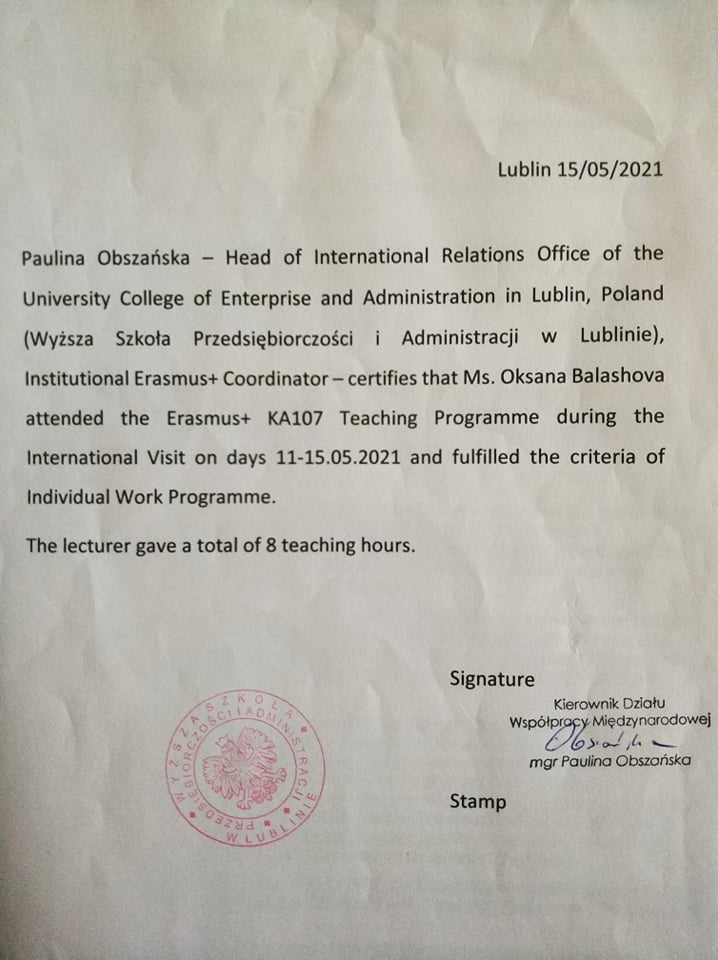 01.09. 2016 – 07.07. 2017 Навчання в Університеті Адама Міцкевича