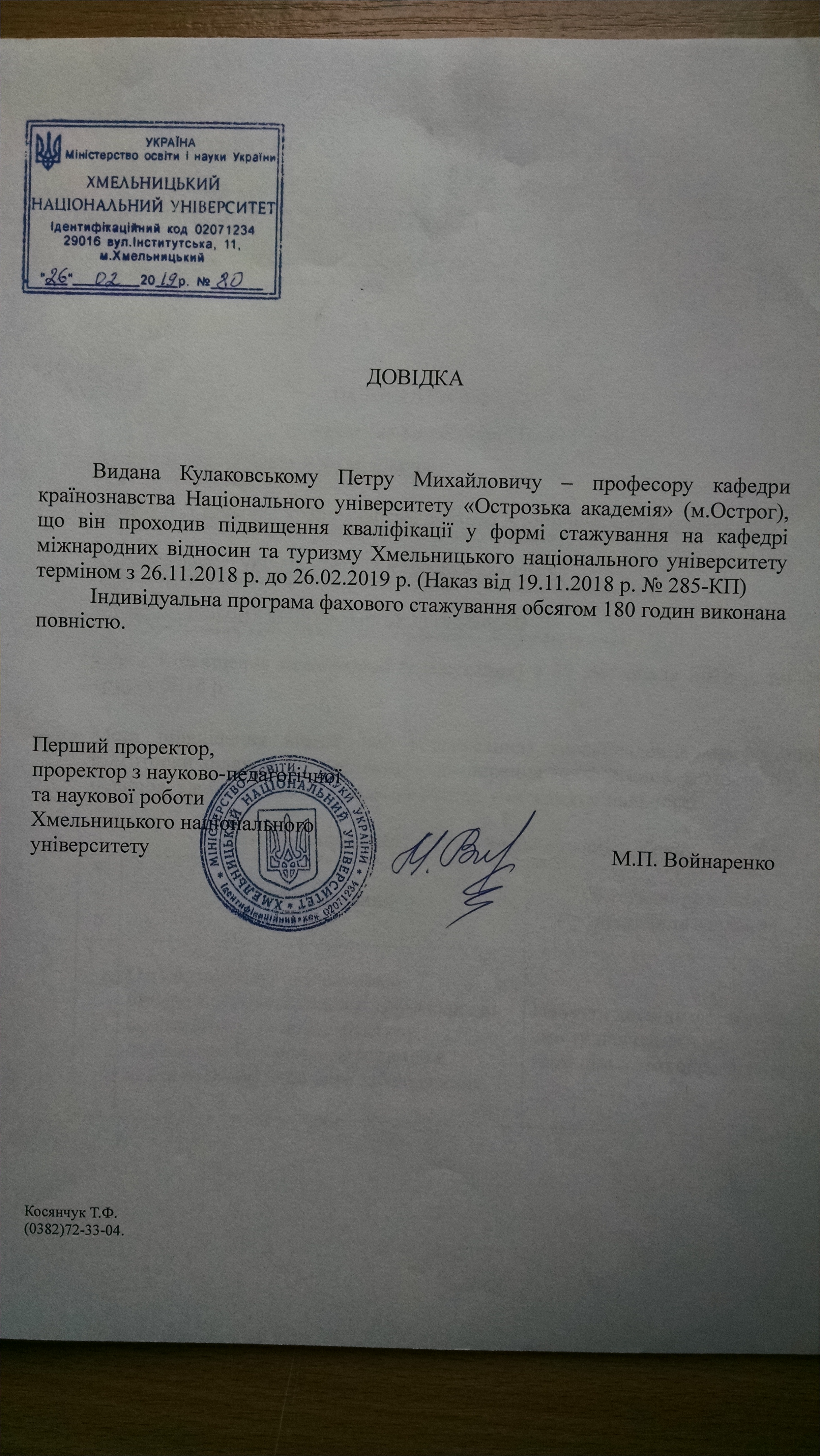 2018.11 - 2019.02 – пройшов стажування та підвищення кваліфікації науково-педагогічних працівників у Хмельницькому національному університеті.