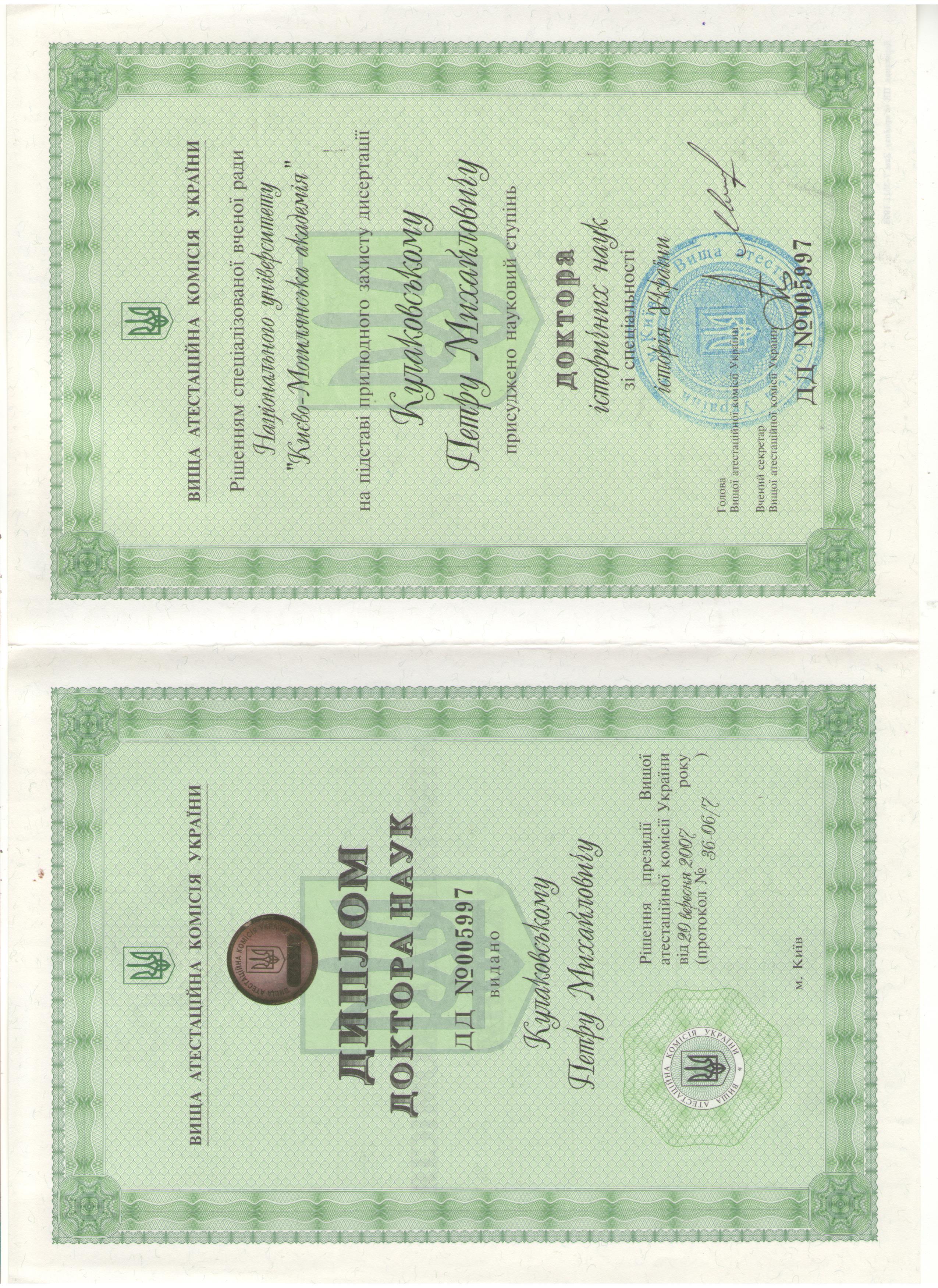 2007 – захист дисертації на здобуття наукового сутпеня доктора історичних наук; диплом ДД № 2005997 від 20.09.2007 р.