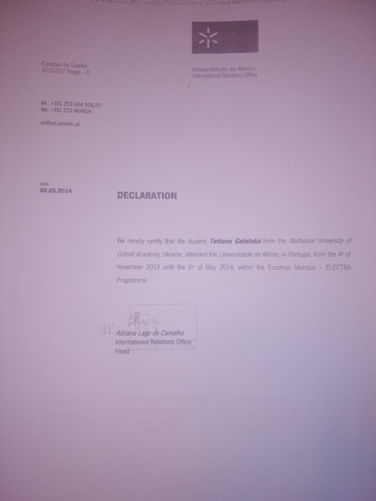 Стипендія Еразмус для проведення досліджень в Університеті Мінго, Брага, Португалія 2013-2014 рр.