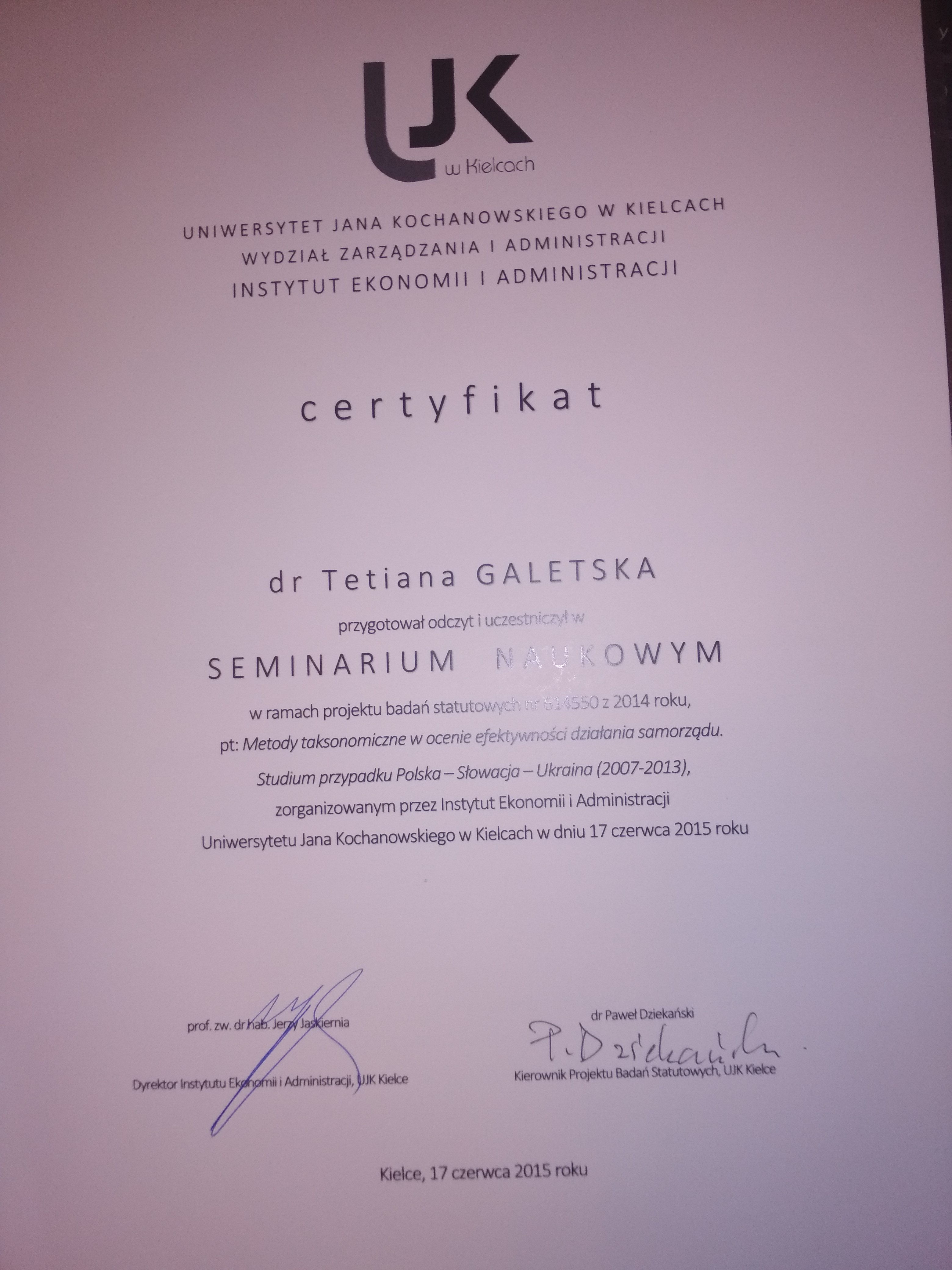 Таксономічні методи в оцінці ефективності місцевого самоврядування : Науковий семінар, Інститут економіки і управління при Університеті Яна Кохановського, 17.06.2015, м. Кельце, Польща, Доповідь: "Місцеве самоврядування в Україні"