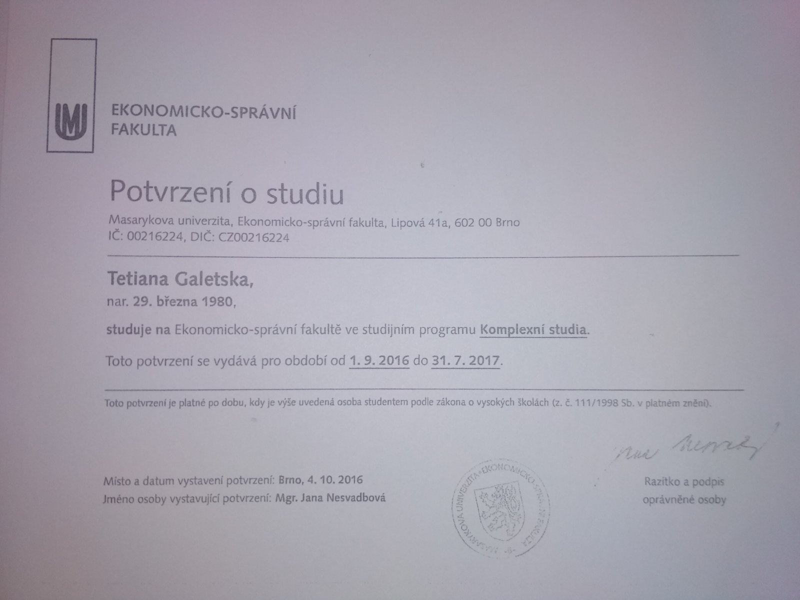 Стипендія Вишеград для проведення досліджень в Університеті Масарика, Брно, Чехія, 2016-2017 рр.