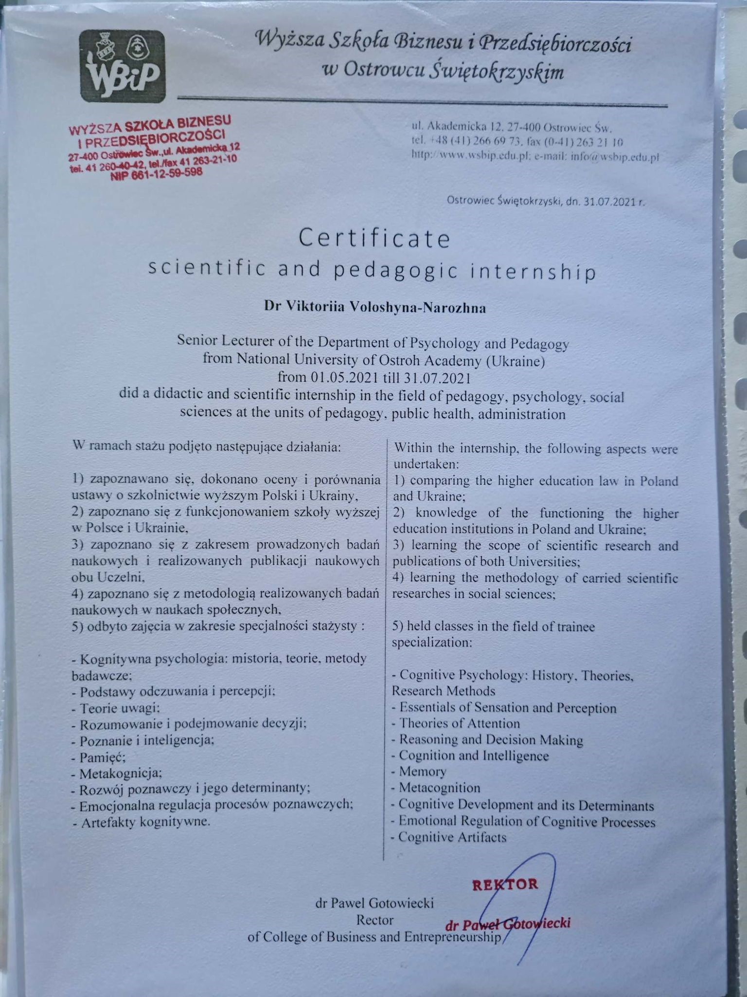 - 01/12/2011–01/12/2014 - Диплом кандидата психологічних наук від 25.02.2016 (спеціальність 19.00.07 "Педагогічна та вікова психологія"). НаУОА.